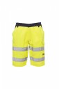 Men's high-visibility shorts with retroreflective strips, side elastics and waist belt loops, zip and plastic button closure. Two classic-cut front pockets, side pocket Lock System, tape measure holder, two back pockets - one open and one with hook-and-loop flap. Contrasting stitching, triple-needle crotch and inner leg seams.