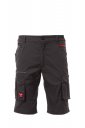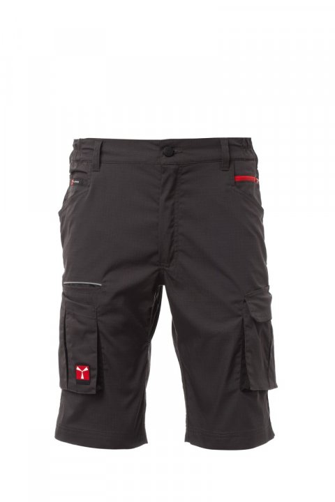 Summer stretch unisex Bermuda shorts with side elastics and belt loops, closure with zip and customised button. On the front, they have two shaped pockets, a coin pocket on the right, a safety pocket closed with a zip on the left. On the front of the left leg there is a pocket with bellows, flap closed with hook-and-loop fastener and badge holder. On the front of the right leg, there are: a smartphone pocket with retroreflective piping and a pocket with bellows. On the back there are: a pocket with flap closed with hook-and-loop fastener, a tape measure pocket (right leg); an open pocket with two retroreflective stripes (left leg). Three-needle seams on the crotch, inside and outside of the leg. Contrasting bartack reinforcement stitching in various points. The middle (Italian) sizes 48-50-52 have a 31 cm regular internal leg length.