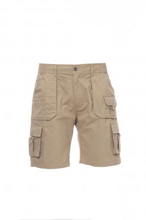 Men’s Bermuda shorts with side elastic and waist belt loops. Zip fastening with metal button, two front pockets, multi-pocket design with three side pockets with flap, two back pockets with flap.