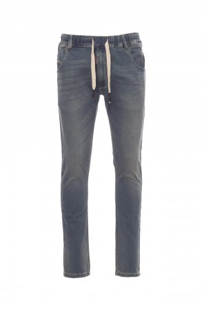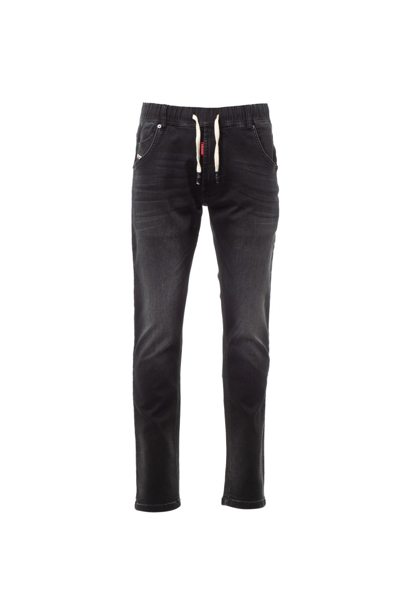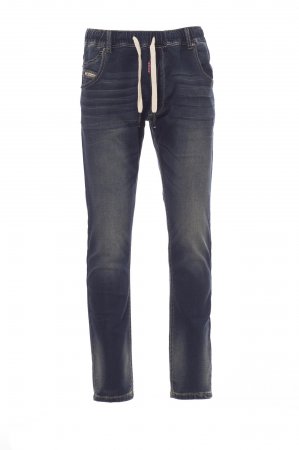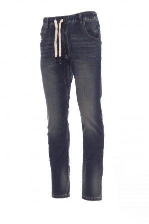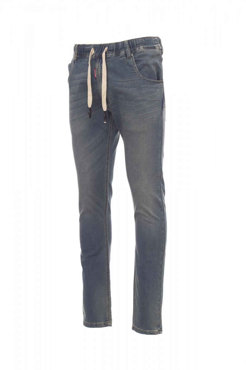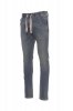 Men’s all-season jeans with five pockets, elasticated, drawstring waist with belt loops, metal zip fastening, worn effect, heavy duty stitching, double seams on inside leg, slim leg, studs and patches in real leather. Fabric weight: 10,50 oz/yd².