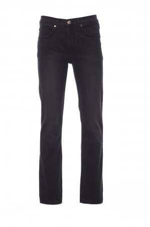 Men’s jeans with five pockets, metal zip fastening with button, belt loops at waist, stone wash, worn, faded effect, contrasting heavy duty stitching, double seams on inside leg, straight leg, studs and patches in real leather. Fabric weight: 12 oz/yd².