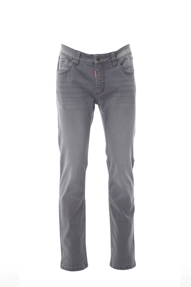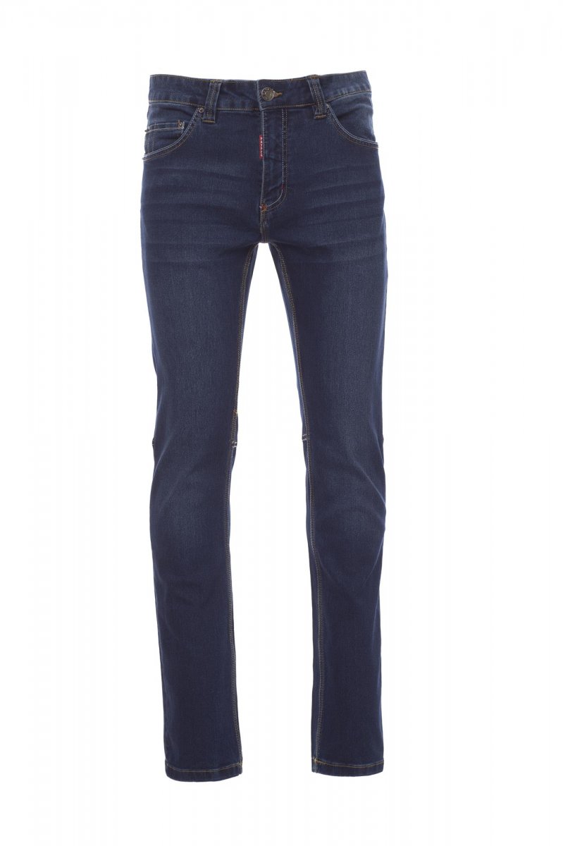 Men’s jeans with five pockets, metal zip and button closure, belt loops at waist, one foldaway tape measure pocket, one pen and cutter holder, stone-washed treatment, worn and faded effect. Straight leg, contrasting heavy duty stitching, triple seams inside leg. Fabric weight: 10.50 oz/yd².
