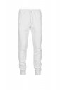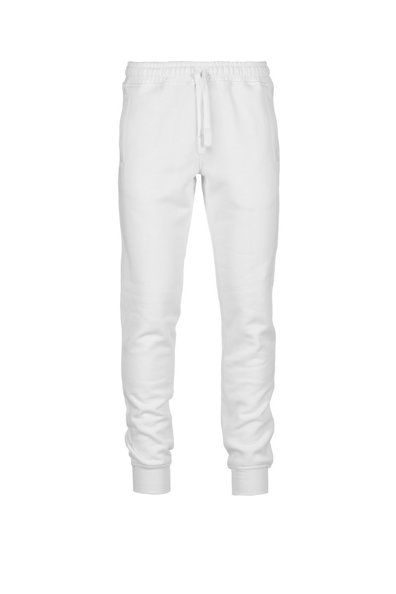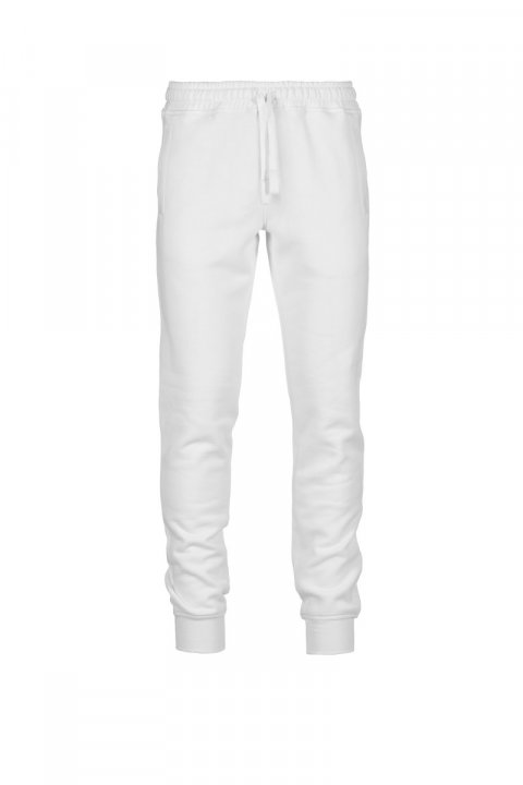 Men's fleece sweatpants, elasticated waist with drawstring and matching cord. Two front welt pockets with ribbing and a small pocket on the back. Ribbing on the bottom of the leg.