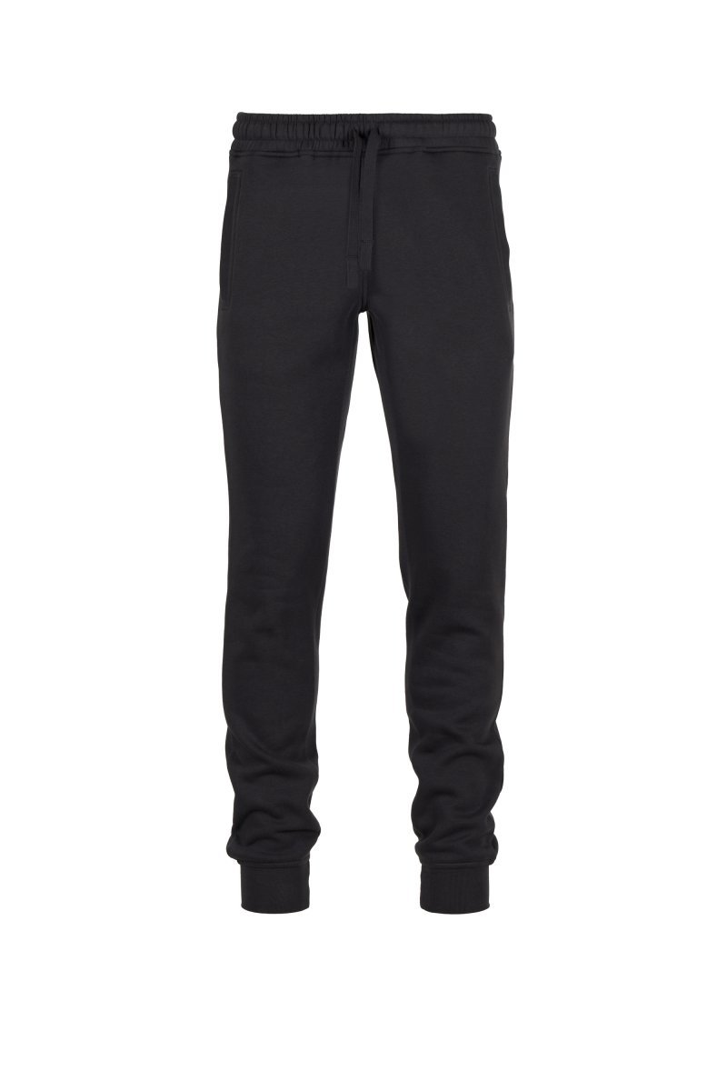 Men's fleece sweatpants, elasticated waist with drawstring and matching cord. Two front welt pockets with ribbing and a small pocket on the back. Ribbing on the bottom of the leg.