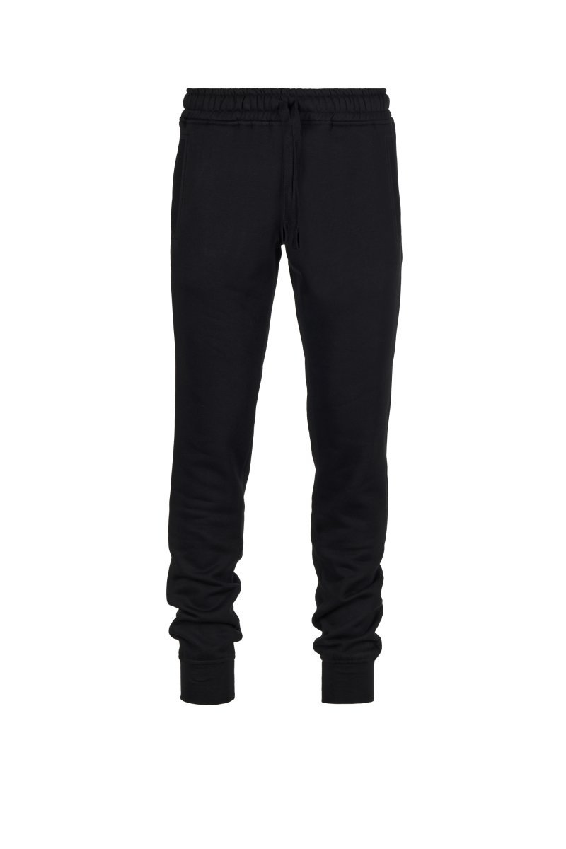 Men's fleece sweatpants, elasticated waist with drawstring and matching cord. Two front welt pockets with ribbing and a small pocket on the back. Ribbing on the bottom of the leg.