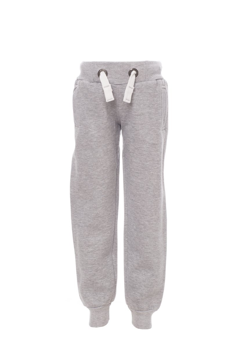 Children's fleece trousers, elasticated waist and leg cuffs, white drawstring with contrasting stitching and buttonholes, two front pockets with ribbing and a small pocket on the back, reinforced seams.