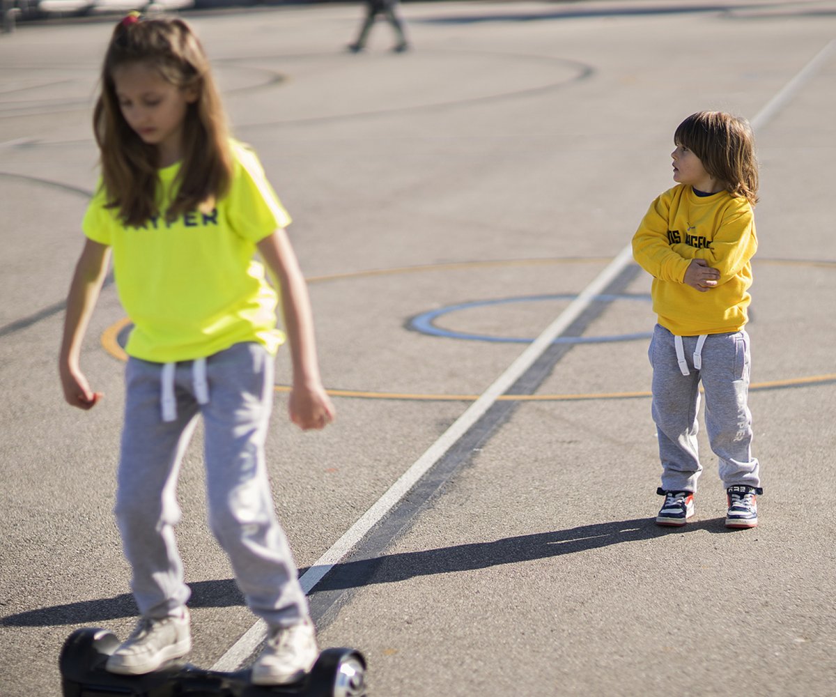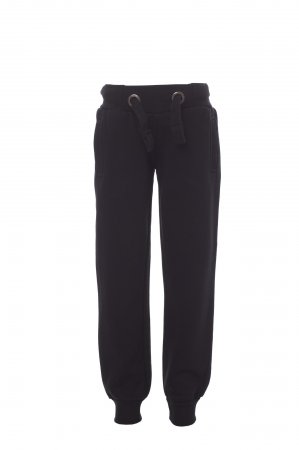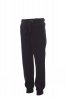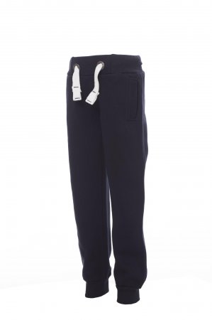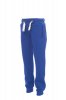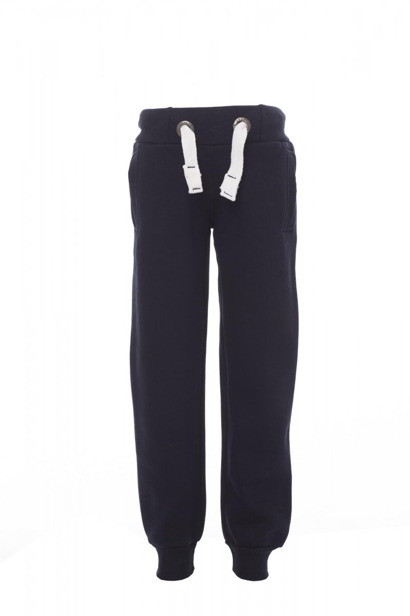 Children's fleece trousers, elasticated waist and leg cuffs, white drawstring with contrasting stitching and buttonholes, two front pockets with ribbing and a small pocket on the back, reinforced seams.