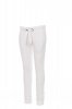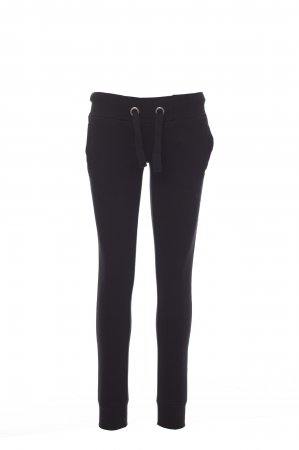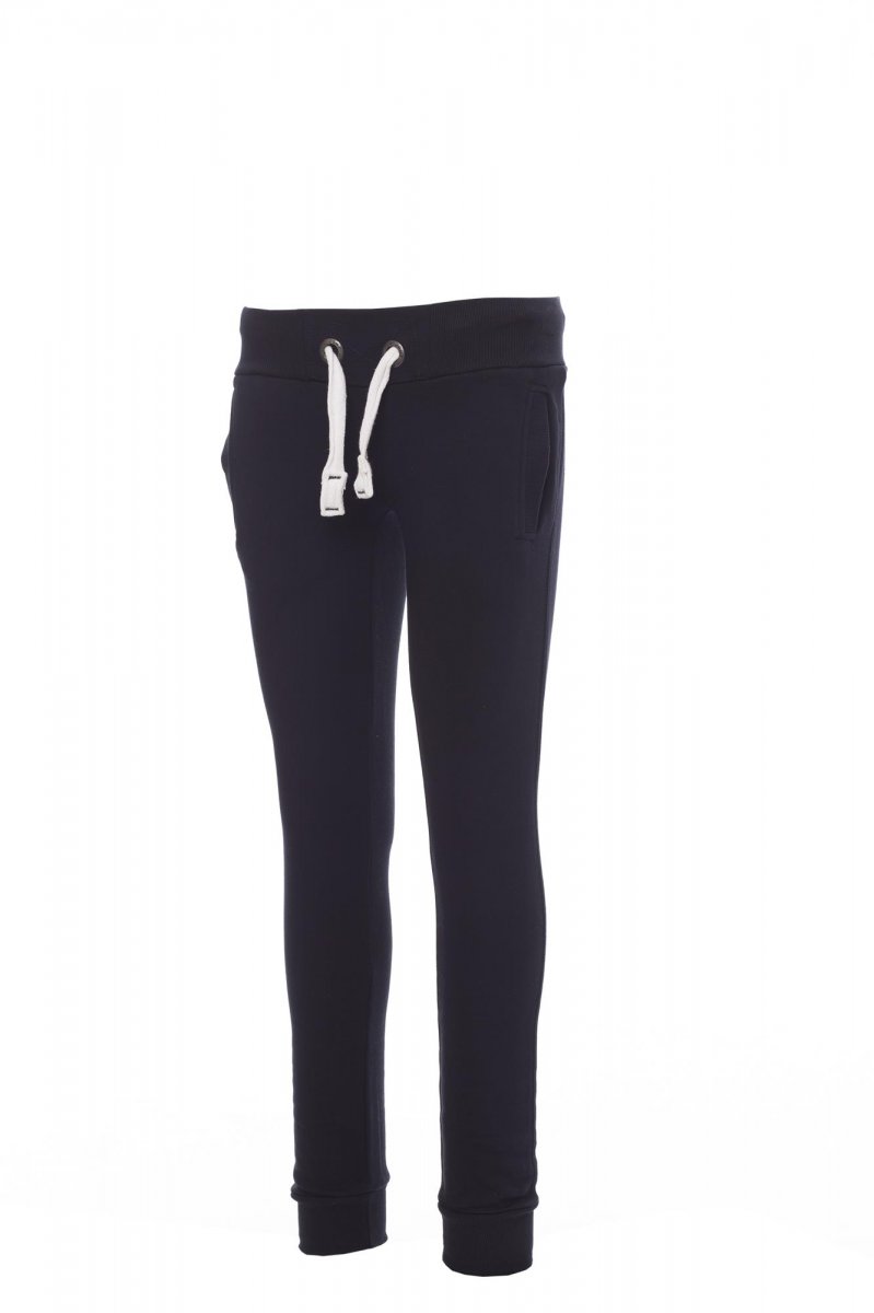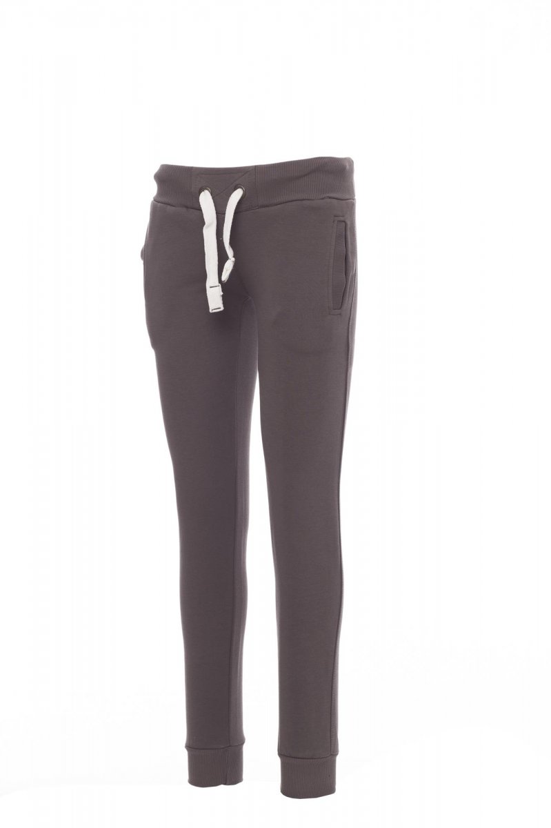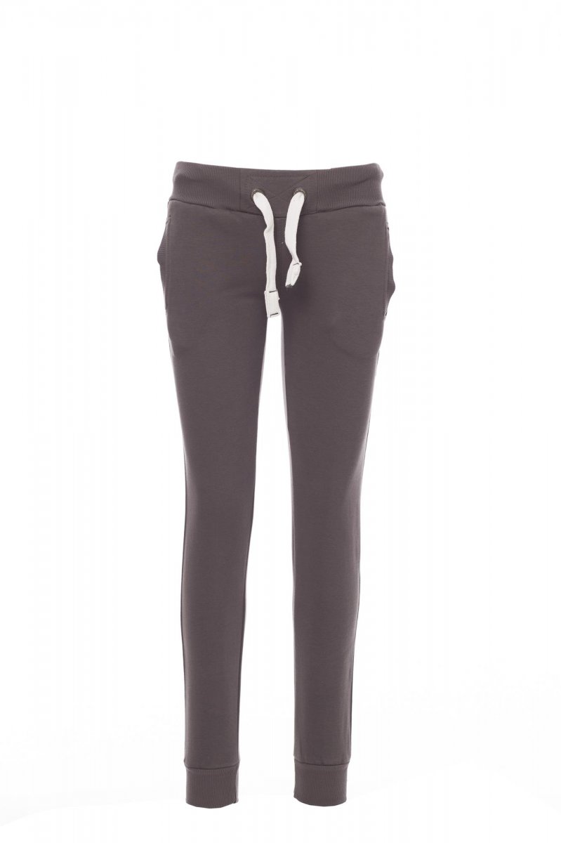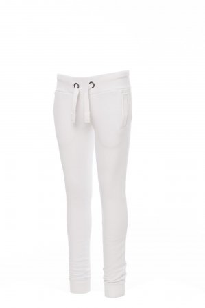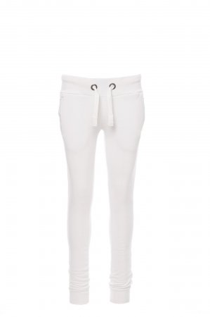 Women’s sweatpants with stretch rib at the waist and bottom of the legs, white drawstring with contrasting stitching and metal rings, two front pockets with rib and reinforced seams.