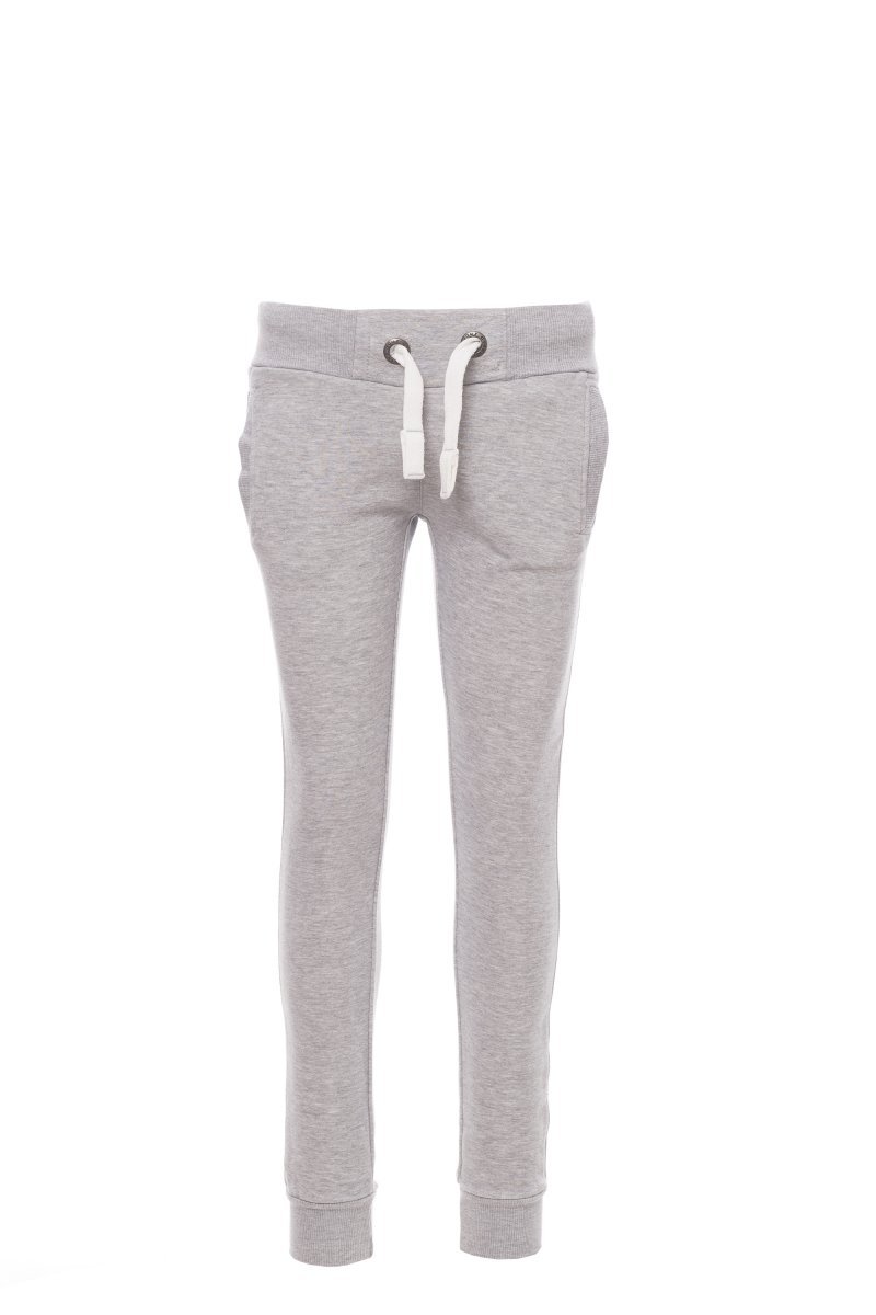 Women’s sweatpants with stretch rib at the waist and bottom of the legs, white drawstring with contrasting stitching and metal rings, two front pockets with rib and reinforced seams.