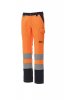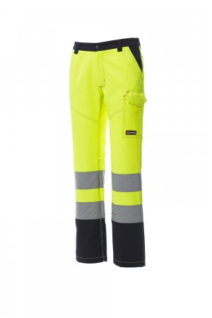 Women’s high visibility, two-tone all-season trousers with reflective stripes, side elastic bands and waist belt loops. Zip fastening with plastic button, two classic front pockets, one LOCK SYSTEM side pocket, a tape measure pocket, two back pockets, one open and one with flap and Velcro. Contrasting stitching, triple seam crotch and inner leg.