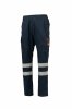 Trousers in antistatic, flame-retardant fabric, with properties resistant to electric arcs and chemicals, ideal for welders. Double and triple contrasting stitching in flame-retardant yarn. Higher shaped waistband at the back for better coverage, with side elastics and belt loops at the waist. Two-tone metal zip fastening covered by a flap and press stud. Front pockets with flap and hook-and-loop fastener. Side bellows pockets, one with a shaped flap with hook-and-look fastener, two-tone metal zip and certification summary label. Two back pockets with flap and hook-and-loop fastener. Two retroreflective stripes on the legs. All visible accessories are flame-resistant. No metal accessory is in direct contact with the user's skin.