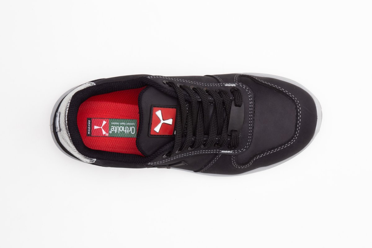 Women's low safety antistatic shoe, upper in water-repellent and breathable leather, inner lining (throughout the internal surface), breathable and resistant to abrasion, 6 + 6 metal-free eyelets, pampas grain heel guard with reflective insert, die-cast aluminium tip, Ortholite X40 016 removable arch support, certified anti-puncture reinforced fabric insole, anti-torsion shank, horseshoe-shaped under-toe, ultra-light polyurethane mid-sole, high tenacity and balanced density polyether MASTER BALANCE cushioning, XTRAIL GRIP outsole in TPU with heel and tip guard.
