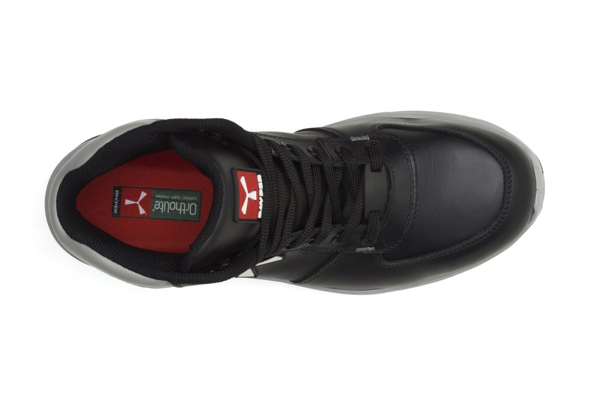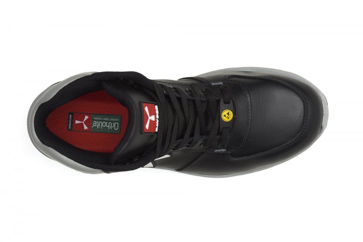 Men's medium safety antistatic shoe, upper in water-repellent and breathable leather, inner lining (throughout the internal surface), breathable and resistant to abrasion, 8 + 8 metal-free eyelets, pampas grain heel guard with reflective insert, die-cast aluminium tip, Ortholite X40 016 removable arch support, certified anti-puncture reinforced fabric insole, anti-torsion shank, horseshoe-shaped under-toe, ultra-light polyurethane mid-sole, high tenacity and balanced density polyether MASTER BALANCE cushioning, XTRAIL GRIP outsole in TPU with heel and tip guard.