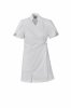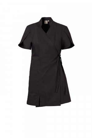 Women's short-sleeved tulip work coat with shawl collar, made of cotton poplin, polyester and Lycra® T400®, with excellent elastic and breathable properties. Wraparound closure with drawstring. Large patch pocket at the bottom, embellished with the iconic Payper tone-on-tone embroidered propeller and small internal pocket. Slits on the front and tuck pleats on the back.