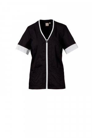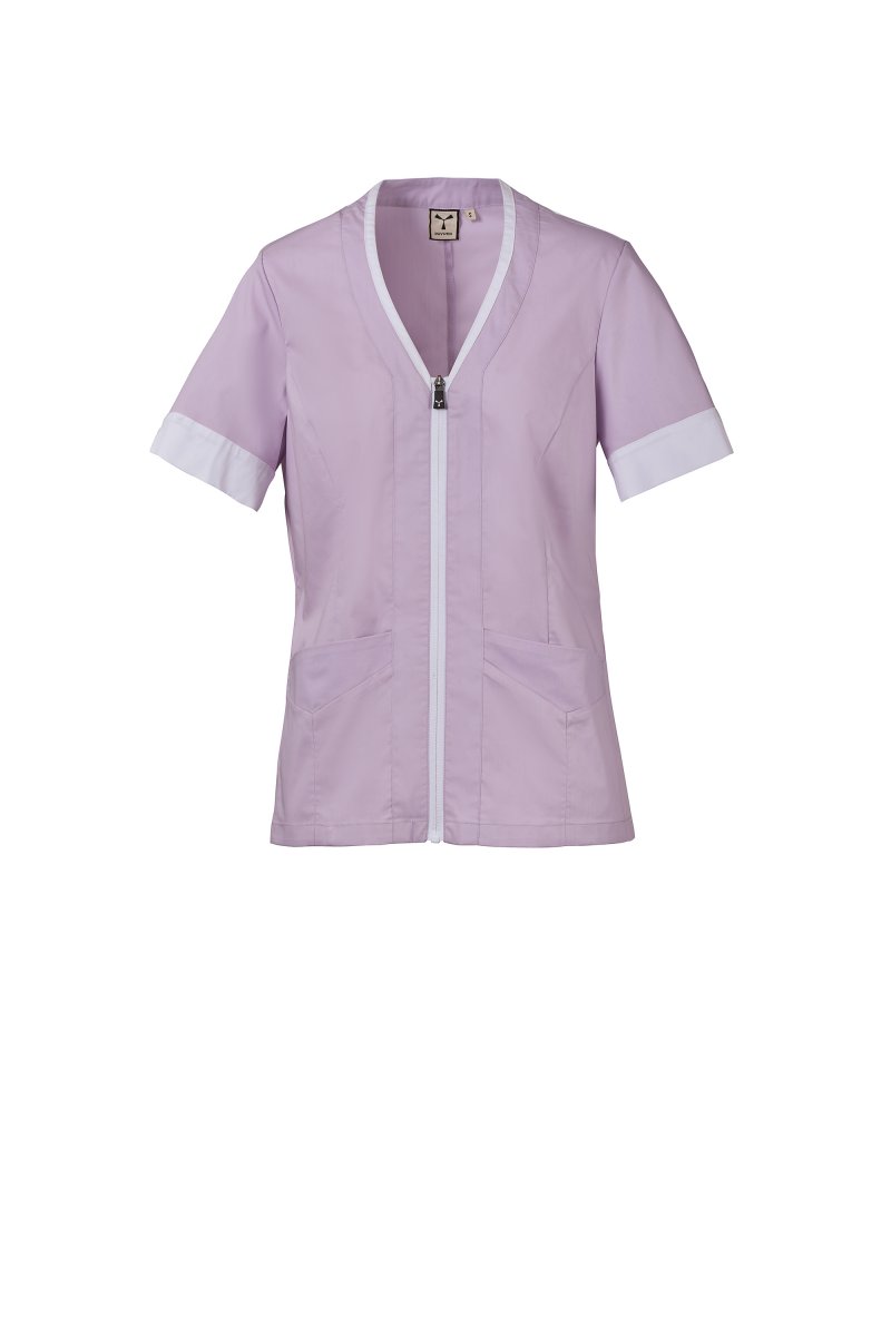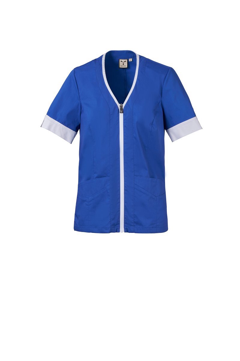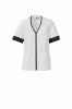 Women's short-sleeved work coat made of cotton poplin, polyester and Lycra® T400®, combined with a comfortable mesh fabric on the back sides, to facilitate movement and improve breathability. V-neckline, finished with a contrasting colour hem. Central zip fastening and contrasting "semi auto-lock" slider. Two low patch pockets, with flap. Sleeves with contrasting hems, one of which with the iconic Payper tone-on-tone embroidered propeller.