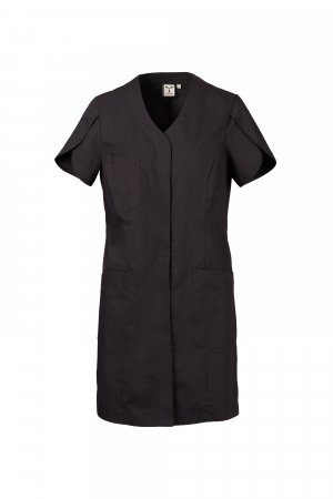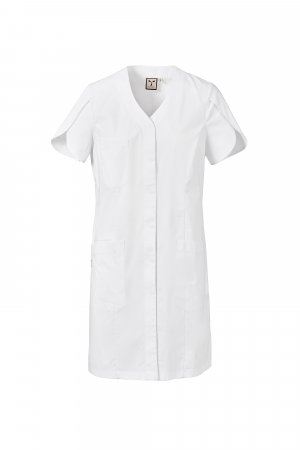 Women's short-sleeved tulip work coat with V-neck, made of cotton poplin, polyester and Lycra® T400®, with excellent elastic and breathable properties. Covered central buttoning. Three large patch pockets: one on the chest; two lower ones, including one with iconic Payper propeller embroidered tone-on-tone and an internal smartphone pocket. o and two low pockets. Back with central cut and on the sides. Slit at the bottom, to facilitate movement.