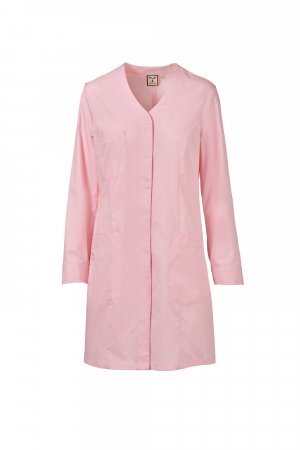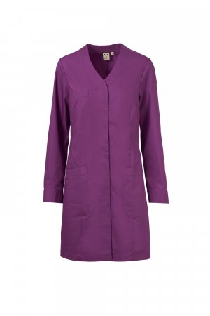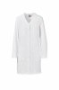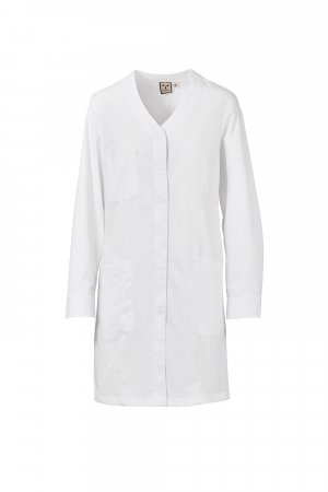 Women's long V-neck work coat made of cotton poplin, polyester and Lycra® T400®, with excellent elastic and breathable properties. Covered central buttoning, long sleeves and cuffs closed with snap buttons. Three patch pockets: one on the chest; two lower ones, one of which with the iconic Payper tone-on-tone embroidered propeller and an internal smartphone holder pocket. Back with central cut and on the sides. Slit at the bottom, to facilitate movement.