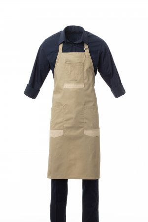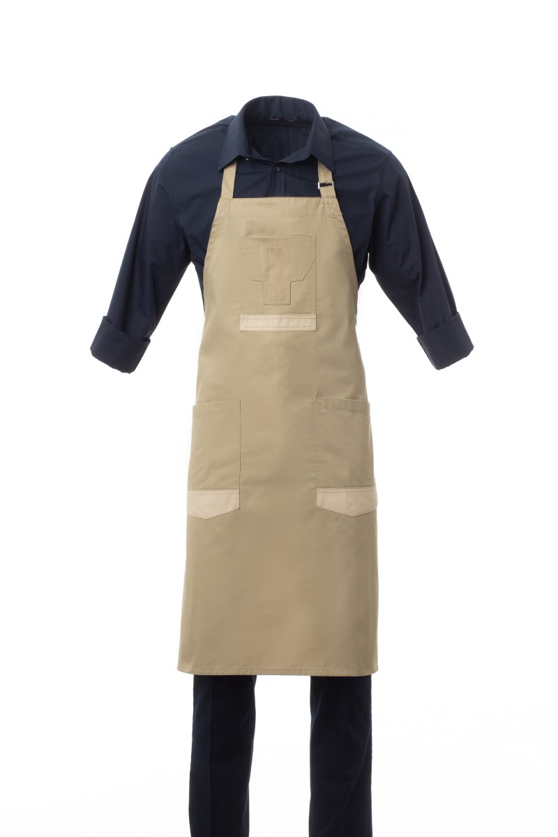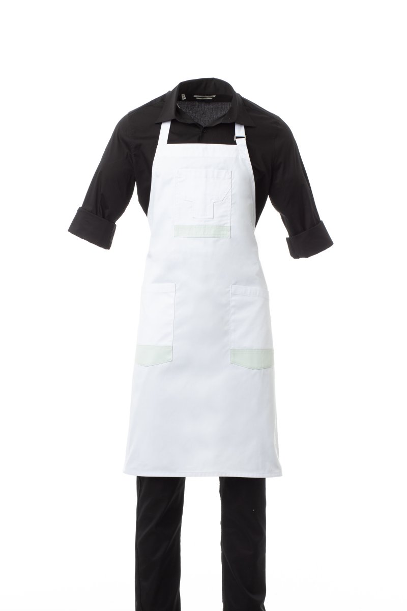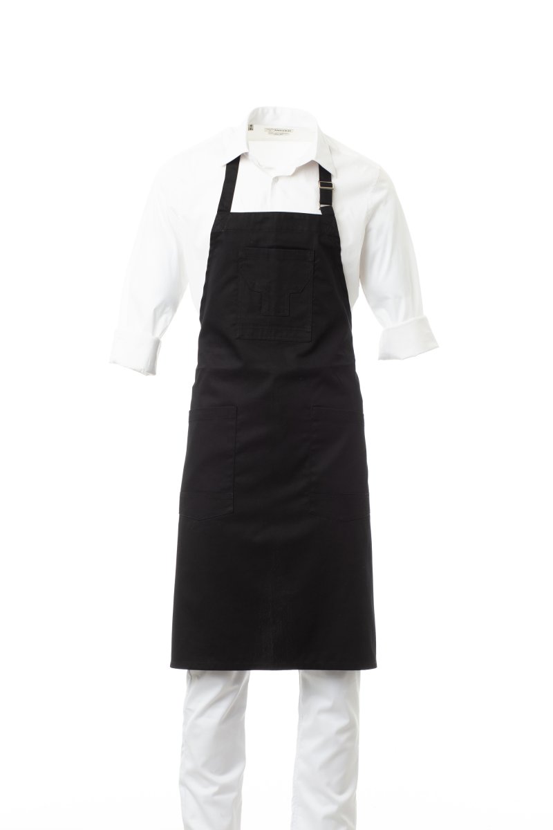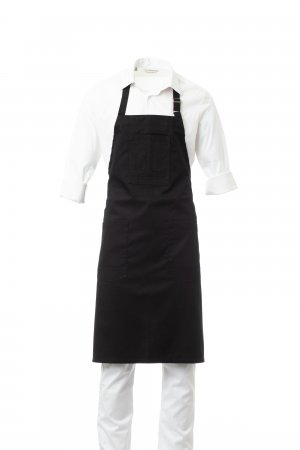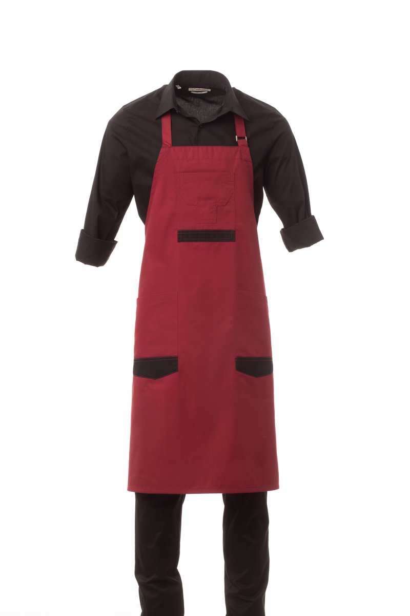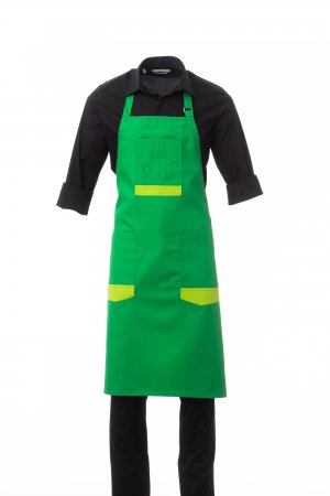 Unisex multipurpose apron with adjustable bib with buckle, made of polycotton fabric. It features a chest pocket with a shaped patch and two waist pockets, one of which has a pen holder space. Reinforced applications on the pocket bottoms, in contrasting colours except for black. Measurements: 80x90cm.