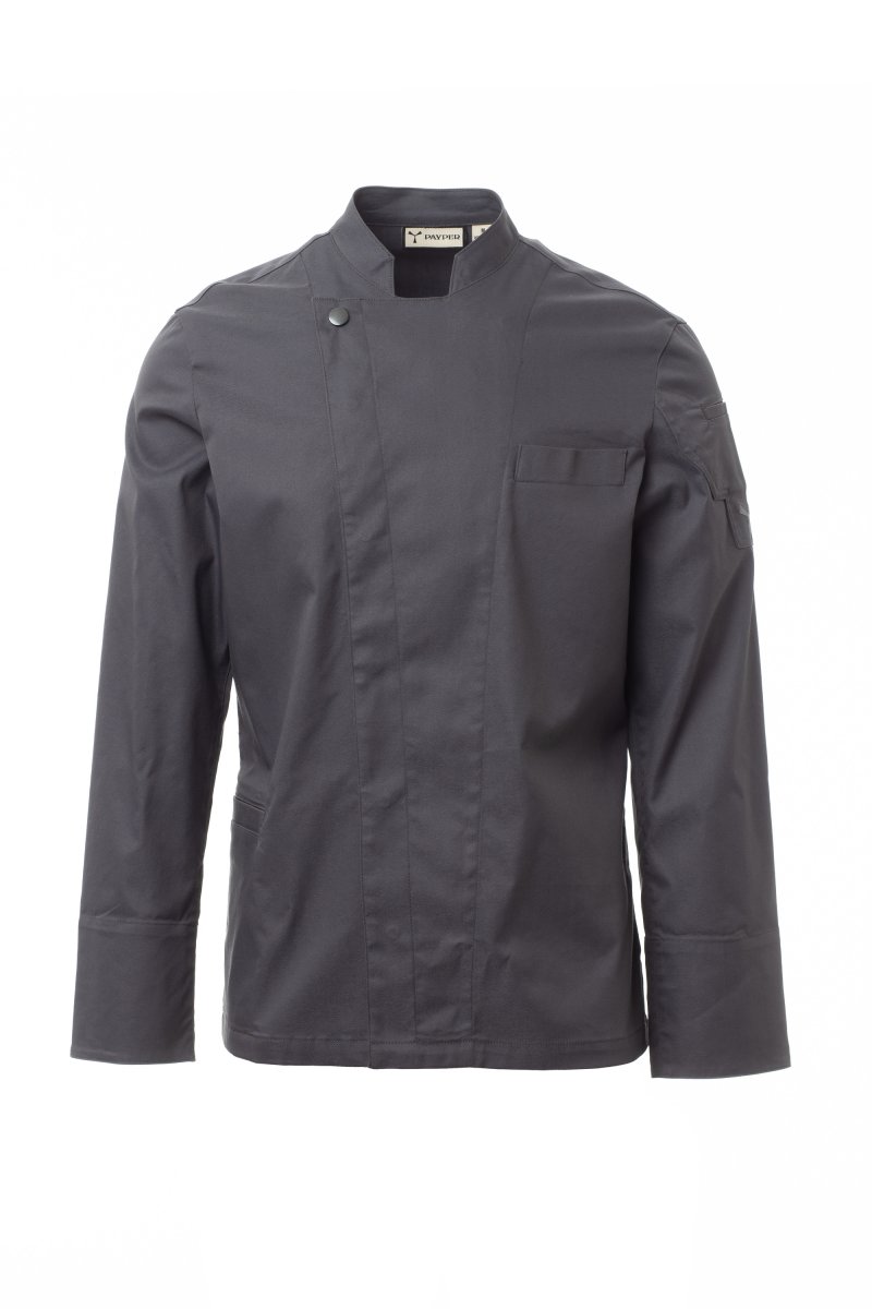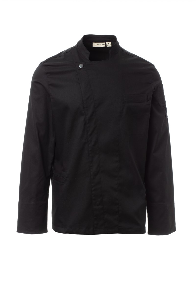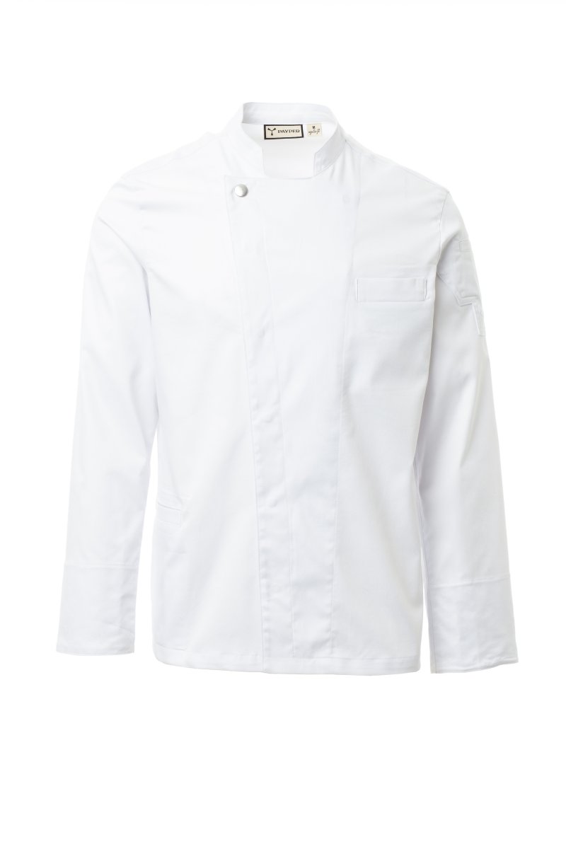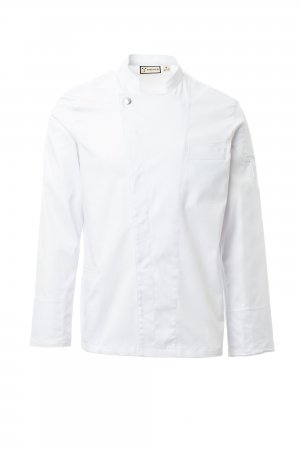 Men’s chef jacket with mandarin collar made of cotton twill and Lycra® T400®, with excellent elastic and breathable properties. Double-breasted closure with snap buttons. Long sleeves with cuffs that can be turned up, bezel with comfortable mesh fabric under the armhole, to facilitate breathability. Iconic shaped patch on the left shoulder, with tone-on-tone propeller embroidery, complete with pen pocket. Chest pocket and practical smartphone holder pocket at the waist. Vertical slits in the lower back to facilitate movement.