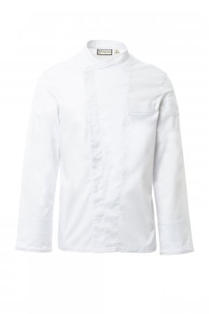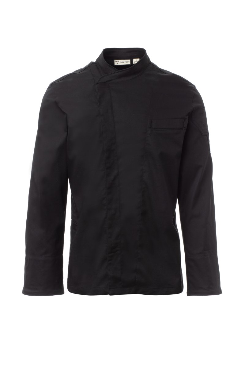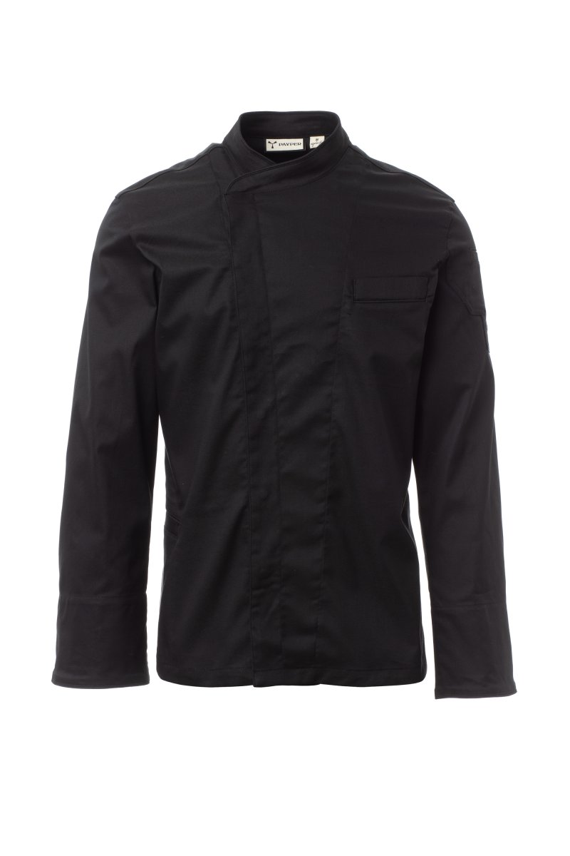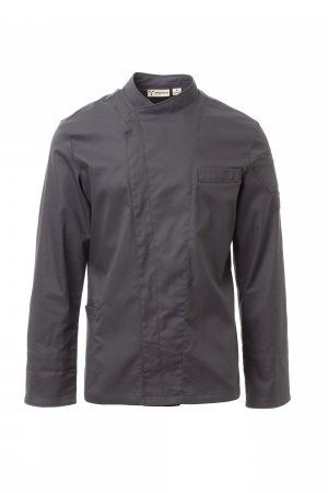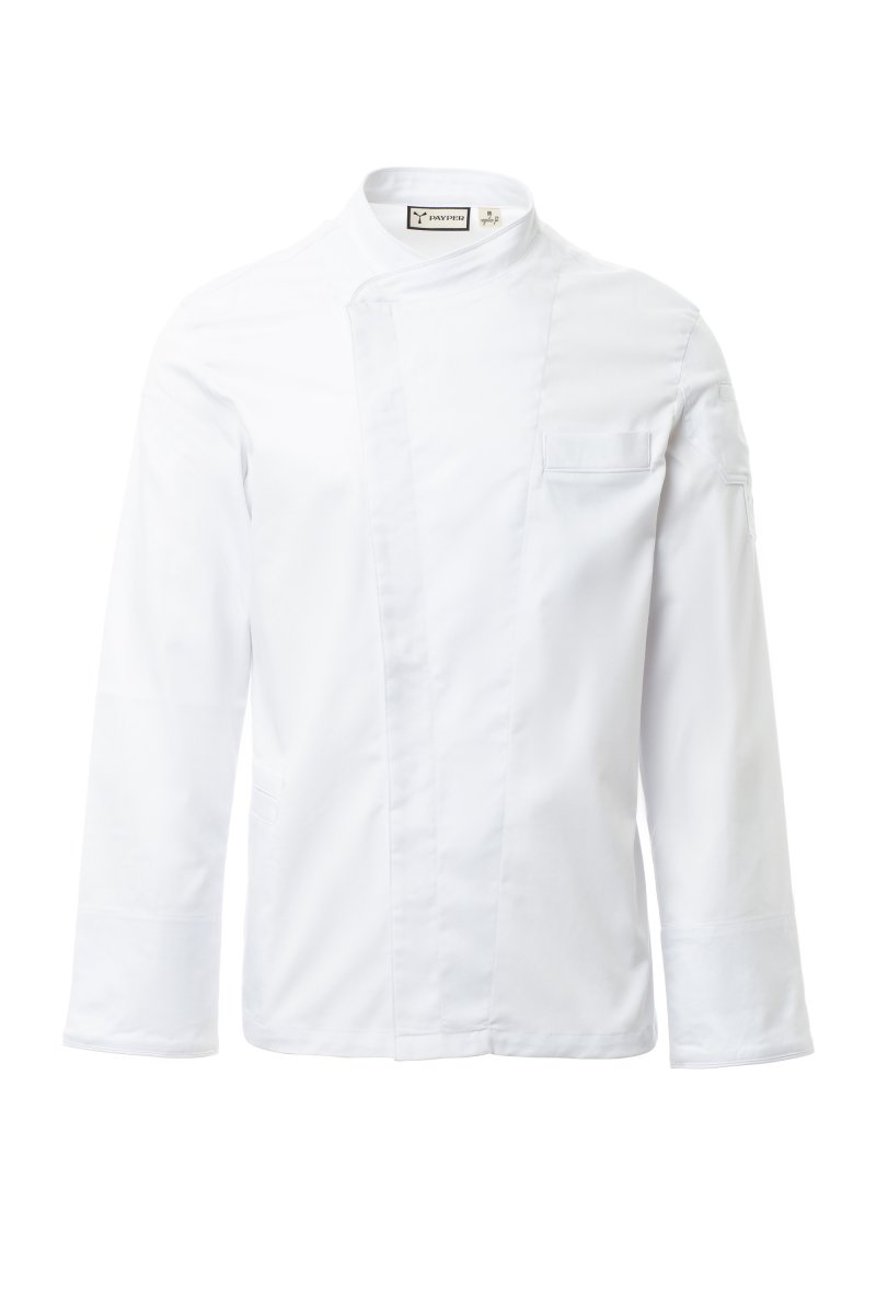 Men’s chef jacket with shawl collar made of cotton twill and Lycra® T400®, with excellent elastic and breathable properties. Double-breasted closure with snap buttons. Long sleeves with rounded cuffs that can be turned up, bezel with comfortable mesh fabric under the armhole, to facilitate breathability. Iconic shaped patch on the left shoulder, with tone-on-tone propeller embroidery, complete with pen pocket. Chest pocket and practical smartphone holder pocket at the waist. Matching profiles on the collar, bottom of the sleeves and chest pocket. Vertical slits in the lower back to facilitate movement.