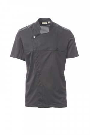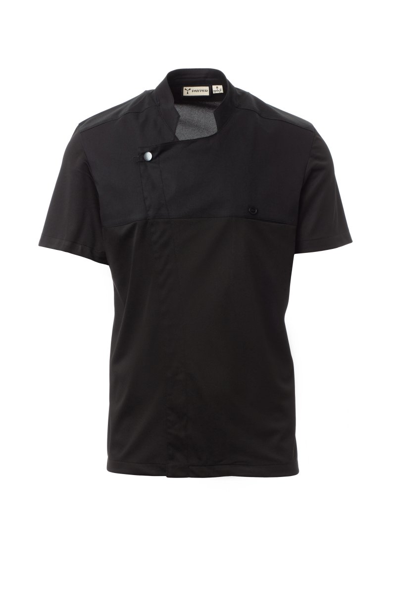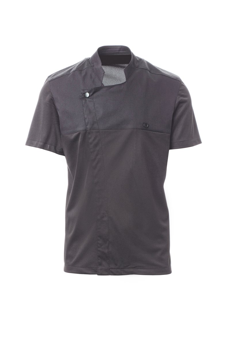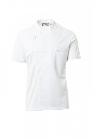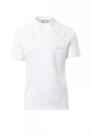 Men’s chef jacket with mandarin collar made of cotton twill and Lycra® T400®, with excellent elastic and breathable properties, and with comfortable mesh fabric on the back, sleeves and waist, to maximise breathability. Double-breasted closure with snap buttons, foldable flap that can be fastened to the chest with a visible button, creating the effect of a tailored lapel and an innovative V-neck. Short sleeves with hem.