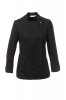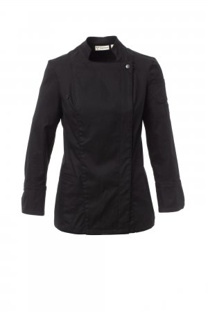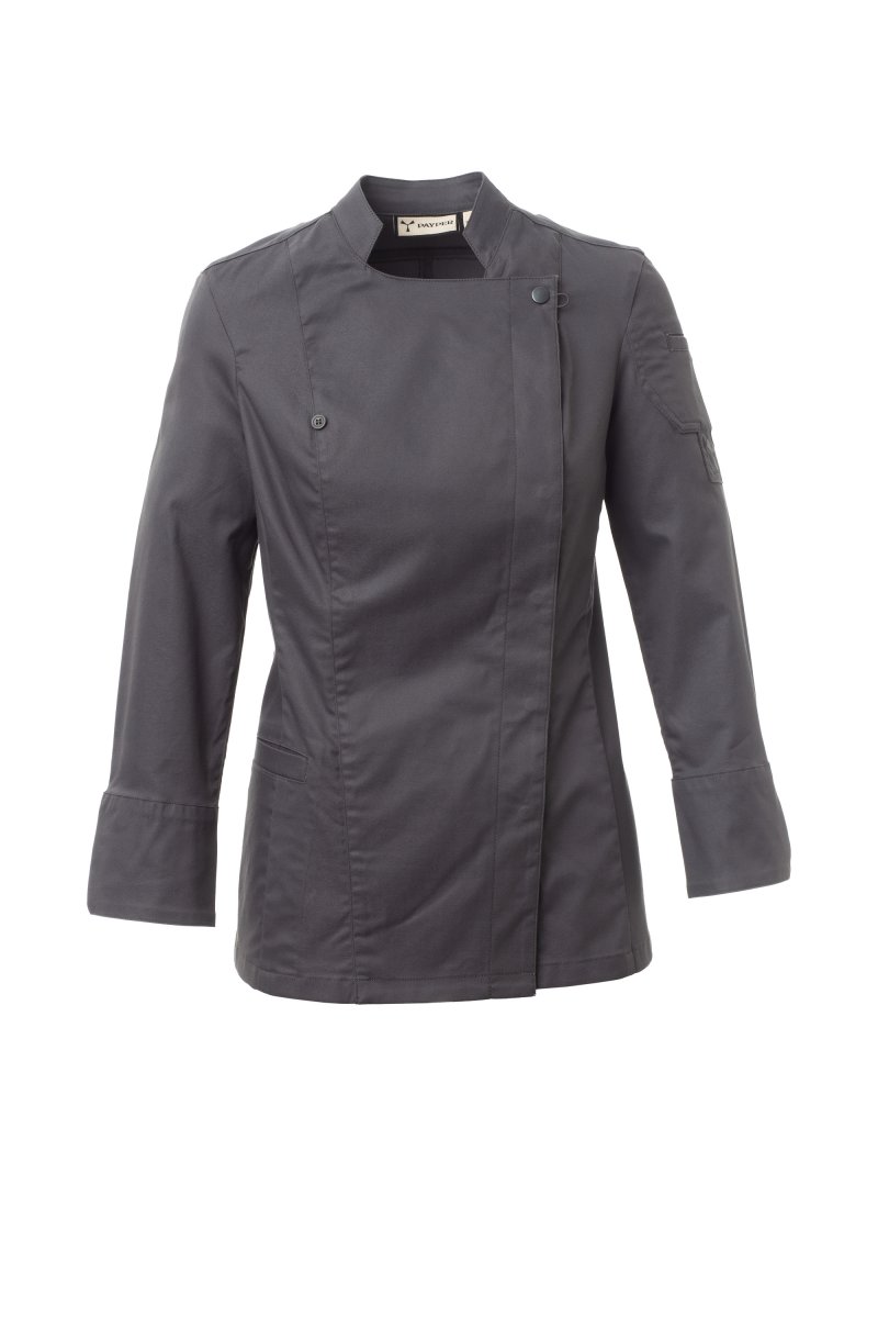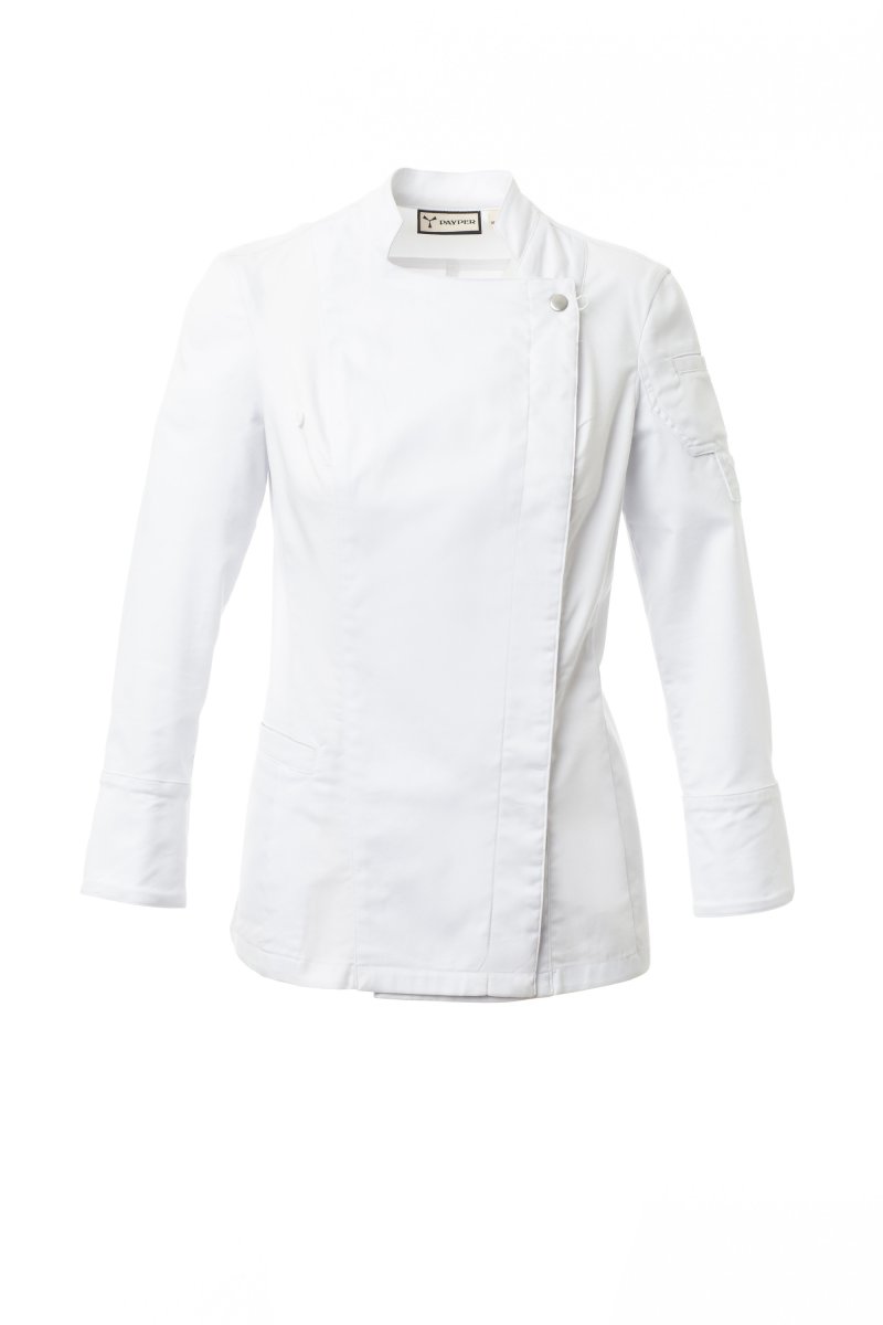 Women’s chef jacket with mandarin collar made of cotton twill and Lycra® T400®, with excellent elastic and breathable properties. Double-breasted closure with snap buttons, foldable flap that can be fastened to the chest with a visible button, creating the effect of a tailored lapel and an innovative V-neck. Long sleeves with cuffs closed by visible press stud. Iconic shaped patch on the left shoulder, with tone-on-tone propeller embroidery, complete with pen pocket. Practical smartphone holder pocket on the waist. Vertical slits in the lower back to facilitate movement.