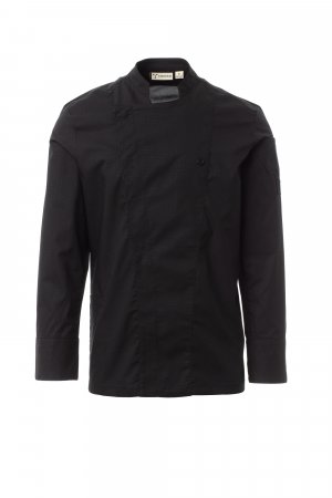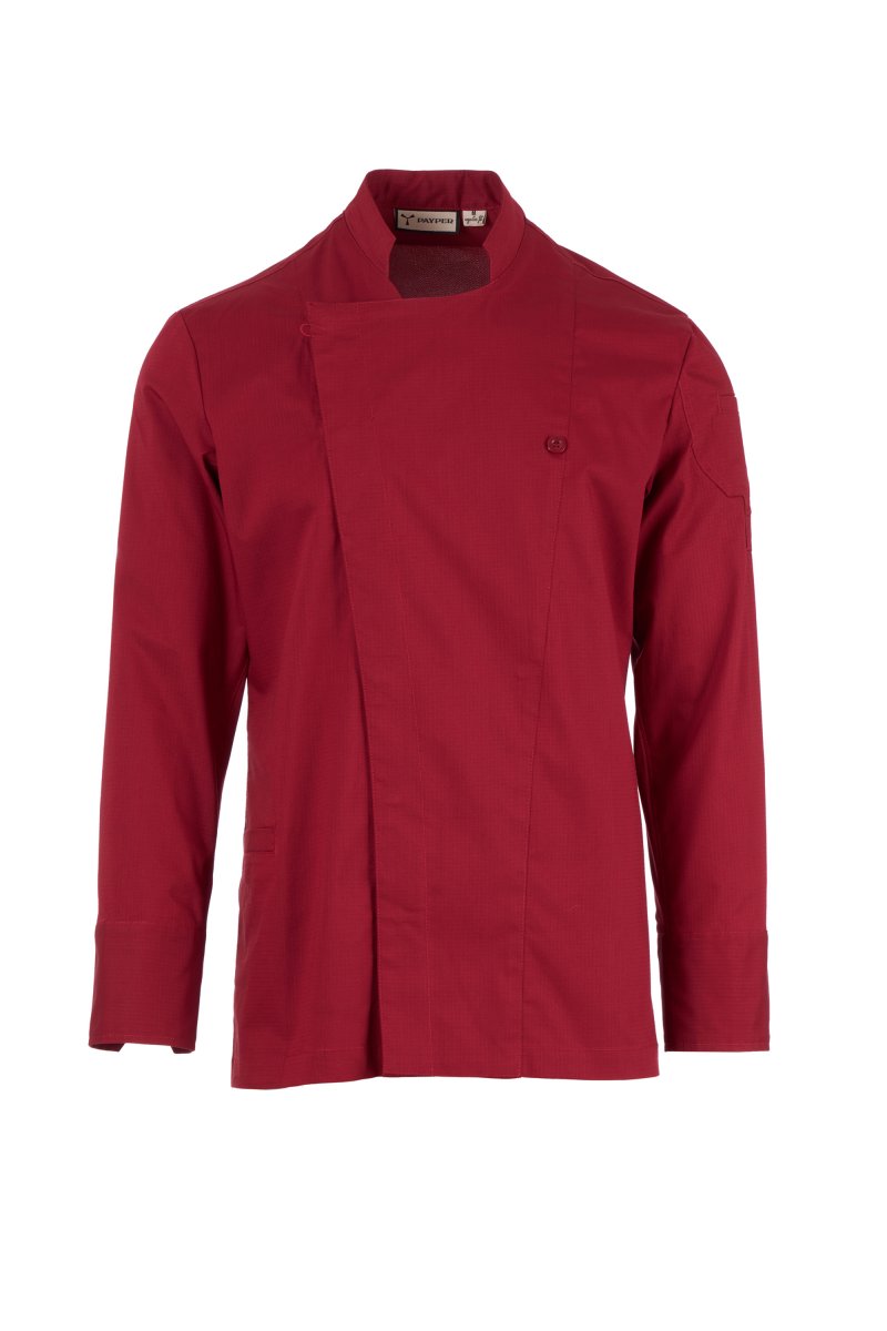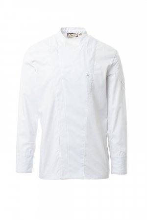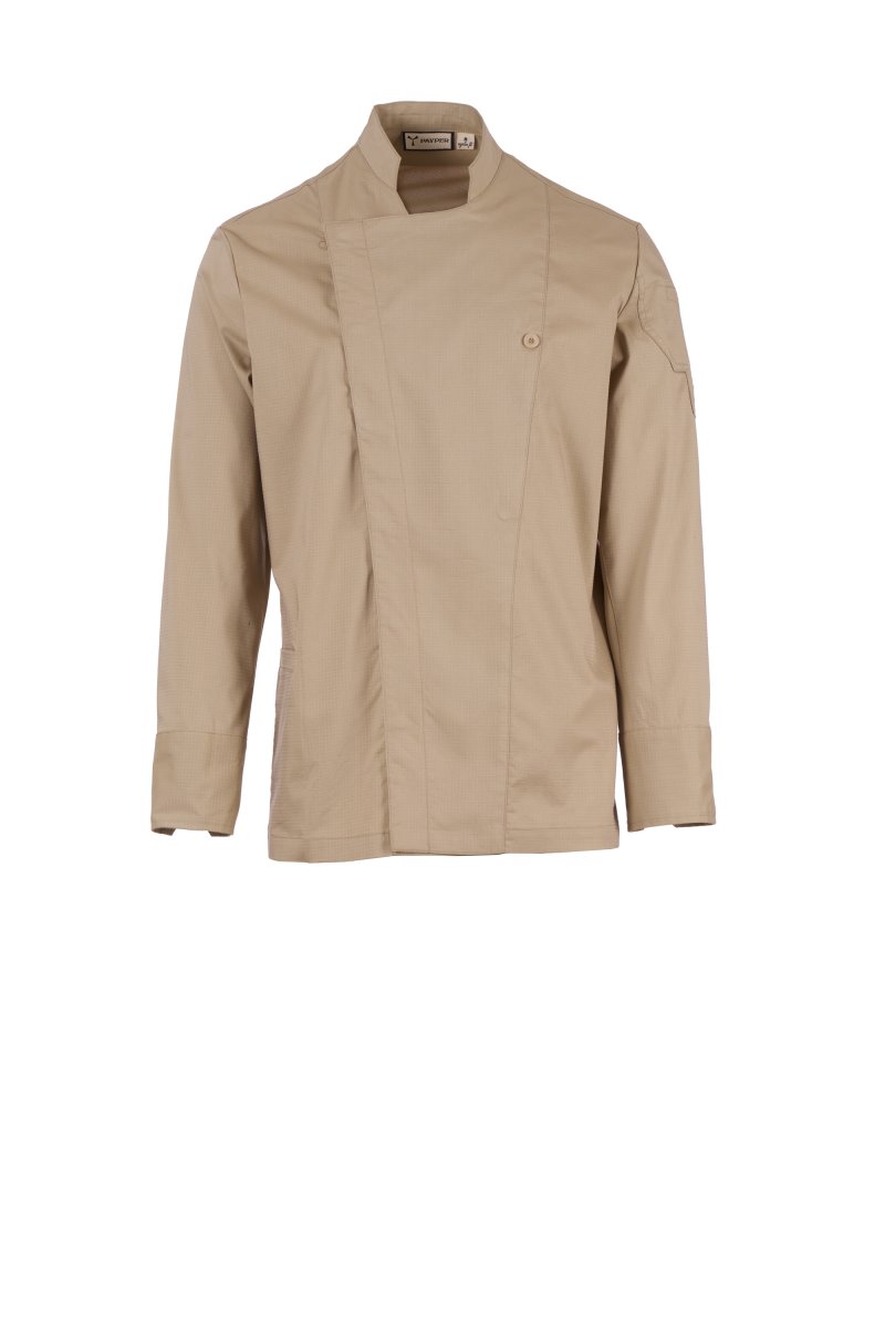 Men’s chef jacket with mandarin collar made of cotton ripstop and Lycra® T400®, with excellent elastic and breathable properties, and with comfortable mesh fabric on the back, underarm and armhole, to amplify breathability. Double-breasted closure with snap buttons, foldable flap that can be fastened to the chest with a visible button, creating the effect of a tailored lapel and an innovative V-neck. Long sleeves with shirt cuffs, closed with a visible snap button. Iconic shaped patch on the left shoulder, with tone-on-tone propeller embroidery, complete with pen pocket. Practical smartphone holder pocket on the waist.