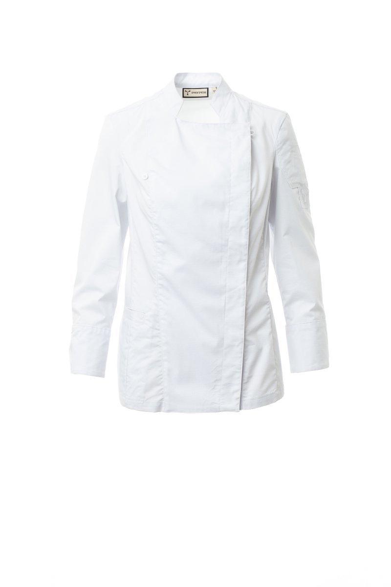 Women’s chef jacket with mandarin collar made of cotton ripstop and Lycra® T400®, with excellent elastic and breathable properties, and with comfortable mesh fabric on the back and underarm, to amplify breathability. Double-breasted closure with snap buttons, foldable flap that can be fastened to the chest with a visible button, creating the effect of a tailored lapel and an innovative V-neck. Long sleeves with shirt cuffs, closed with a visible snap button. Iconic shaped patch on the left shoulder, with tone-on-tone propeller embroidery, complete with pen pocket. Practical smartphone holder pocket on the waist.
