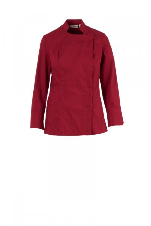 Women’s chef jacket with mandarin collar made of cotton ripstop and Lycra® T400®, with excellent elastic and breathable properties, and with comfortable mesh fabric on the back and underarm, to amplify breathability. Double-breasted closure with snap buttons, foldable flap that can be fastened to the chest with a visible button, creating the effect of a tailored lapel and an innovative V-neck. Long sleeves with shirt cuffs, closed with a visible snap button. Iconic shaped patch on the left shoulder, with tone-on-tone propeller embroidery, complete with pen pocket. Practical smartphone holder pocket on the waist.