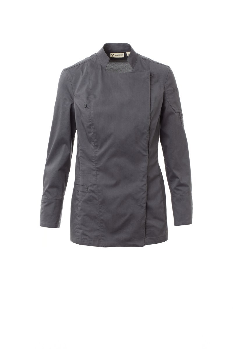 Women’s chef jacket with mandarin collar made of cotton ripstop and Lycra® T400®, with excellent elastic and breathable properties, and with comfortable mesh fabric on the back and underarm, to amplify breathability. Double-breasted closure with snap buttons, foldable flap that can be fastened to the chest with a visible button, creating the effect of a tailored lapel and an innovative V-neck. Long sleeves with shirt cuffs, closed with a visible snap button. Iconic shaped patch on the left shoulder, with tone-on-tone propeller embroidery, complete with pen pocket. Practical smartphone holder pocket on the waist.