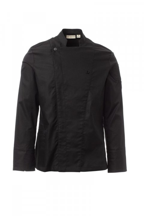 Men’s chef jacket with mandarin collar made of cotton twill and Lycra® T400®, with excellent elastic and breathable properties. Double-breasted closure with snap buttons, foldable flap that can be fastened to the chest with a visible button, creating the effect of a tailored lapel and an innovative V-neck. Long sleeves with cuffs that can be turned up, mesh fabric lunette under the armhole, to facilitate breathability. Iconic shaped patch on the left shoulder, with tone-on-tone propeller embroidery, complete with pen pocket. Practical smartphone holder pocket on the waist. Vertical slits in the lower back to facilitate movement.
