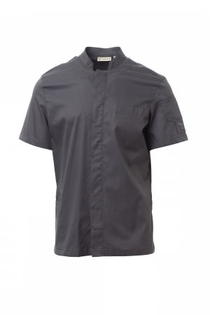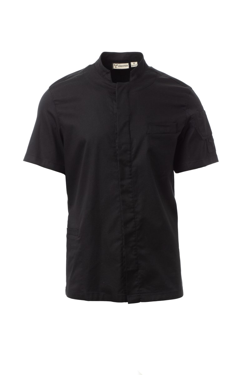 Men’s chef jacket with mandarin collar made of cotton twill and Lycra® T400®, with excellent elastic and breathable properties. Central closure with snap buttons. Short sleeves with hem, mesh fabric lunette under the armhole, to facilitate breathability. Iconic shaped patch on the left shoulder, with tone-on-tone propeller embroidery, complete with pen pocket. Chest pocket and practical smartphone holder pocket at the waist. Vertical slits in the lower back to facilitate movement.