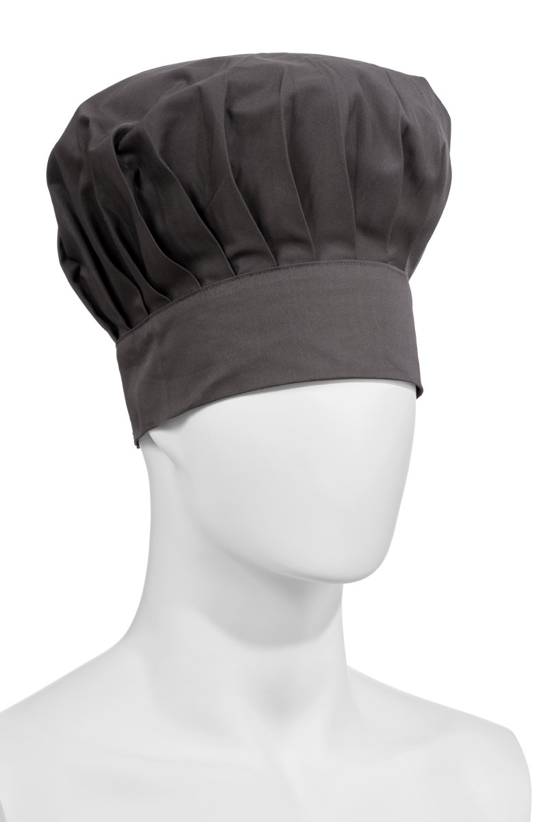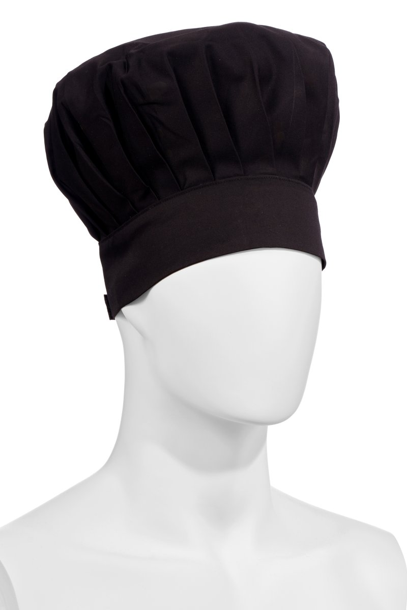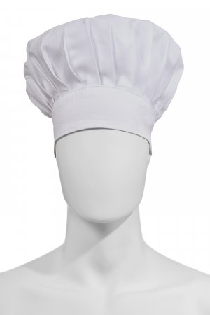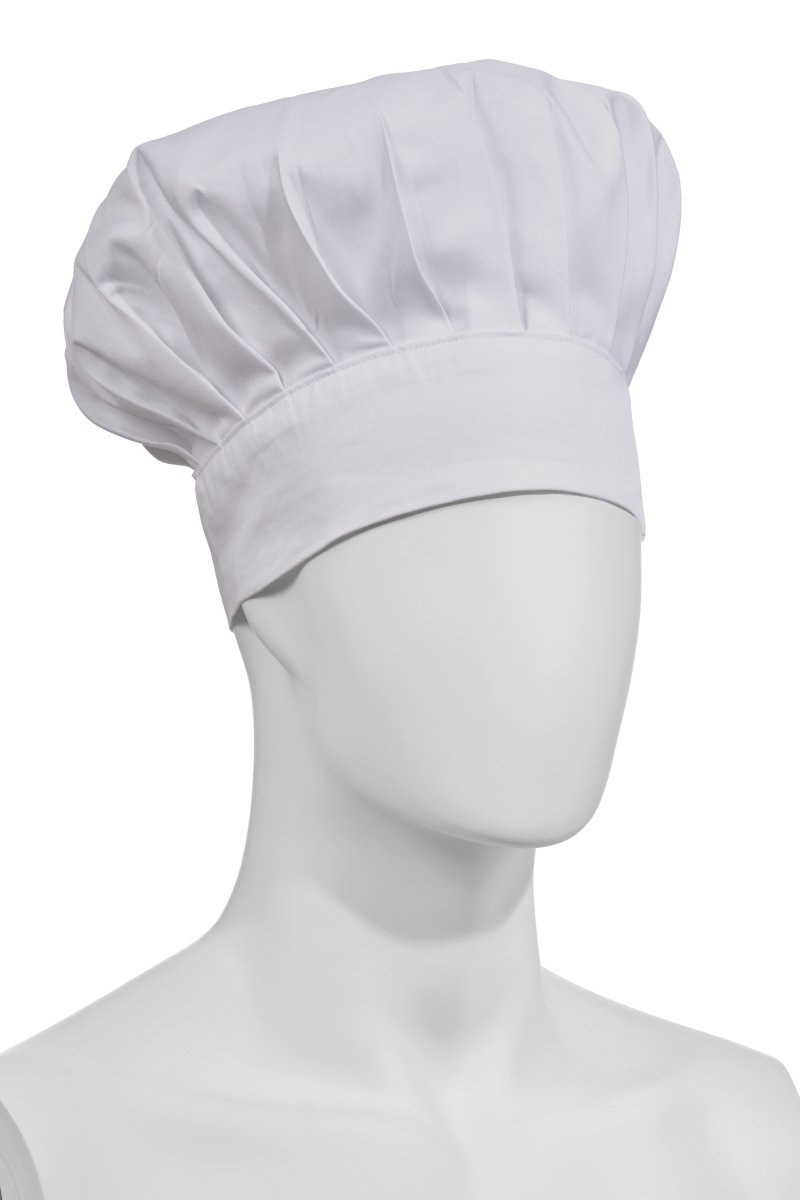Low chef's hat, unisex, with regular pleats, made of cotton twill and Lycra® T400® with excellent elastic and breathable properties. Adjustable circumference with hook-and-loop fastener. Customised label on the back.