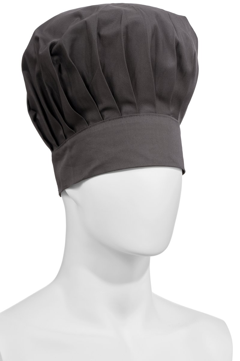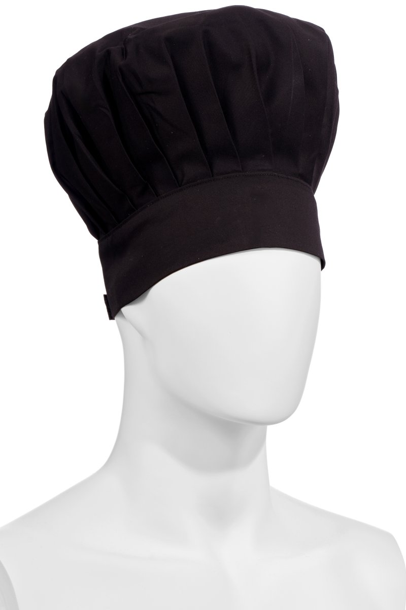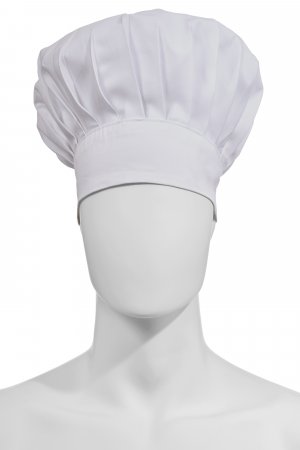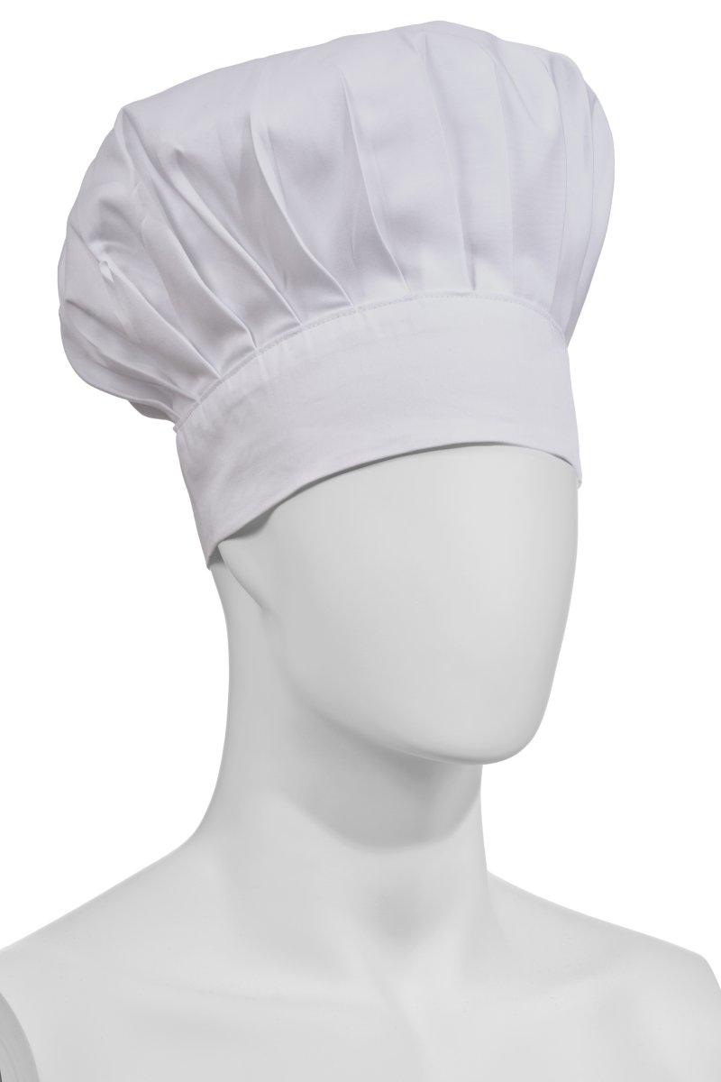 High chef's hat, unisex, with regular pleats, made of cotton twill and Lycra® T400®, with excellent elastic and breathable properties. Adjustable circumference with hook-and-loop fastener. Customised label on the back.