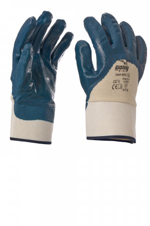 NBR gloves, ventilated back, oversleeve, coated jersey cotton. Features: sturdy, very resistant. Strengths: fit, grip, protection, resistant to liquids, practical. Areas of application: heavy-duty handling, metals, sharp and abrasive materials, oil, grease, dirt, hydrocarbons, lubricants. Minimum saleable unit: 1 dozen (12 pairs).