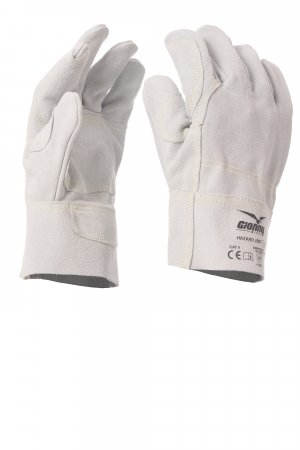 Fully bovine split leather glove. Reinforced bovine split leather palm, thumb and index finger. Vein protection and 7 cm bovine split leather safety cuff. Elastic cuffs, to prevent the glove from coming off. Para-aramid yarn stitching. Features: strong, very resistant. Strengths: grip, protection, dexterity. Areas of application: suitable for handling heavy, sharp-cornered, rough, abrasive and hot objects, for cleaning systems, for joinery and metal carpentry. Minimum saleable unit: 1 dozen (12 pairs).