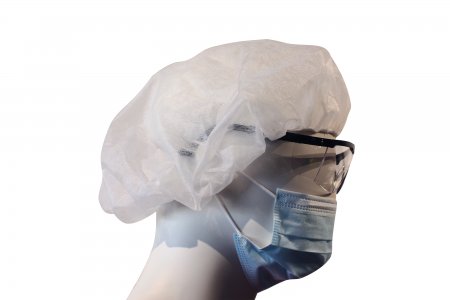 Disposable head cap in "non-woven fabric" with elasticated head band. 1000-piece box packed in 100-unit bags.