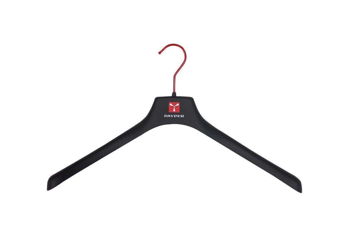 Percha para chaquetas con hombros ergonómicos para un mejor ajuste de la prenda, cuello plano con logotipo impreso, acabado de goma suave al tacto ligeramente antideslizante.