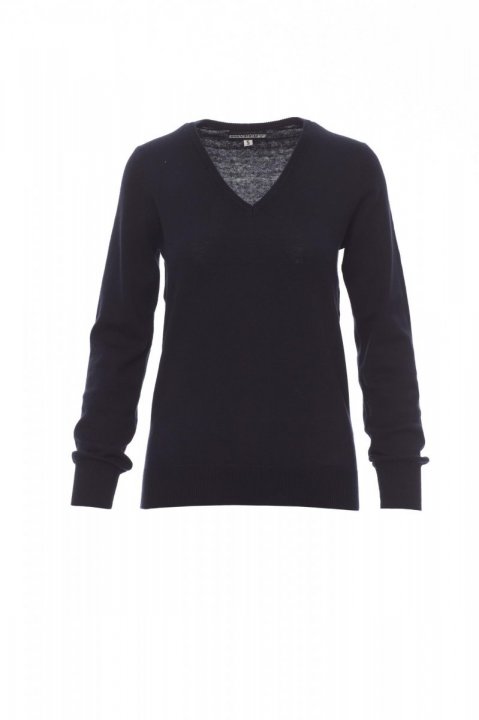 Jersey de mujer con escote en "V", de punto liso fino, confección con tejido de punto menguado sin costuras, borde del cuello, puños y bajo de canalé fino.