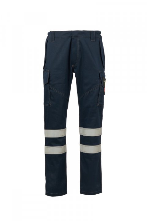 Pantalones en tejido antiestático, ignífugo, con propiedades resistentes al arco eléctrico y a los agentes químicos, ideal para soldadores. Costuras dobles y triples a contraste en hilo ignífugo. Cintura contorneada más alta en la espalda para una mejor cobertura, con elásticos laterales y trabillas en la cintura. Cierre con cremallera metálica bicolor cubierta por solapa y botón a presión. Bolsillos delanteros con solapa y cierre de gancho y bucle. Grandes bolsillos laterales de fuelle, uno de los cuales con solapa contorneada con cierre de gancho y bucle, cremallera metálica bicolor y etiqueta de resumen de las certificaciones. Dos bolsillos traseros con solapa y cierre de gancho y bucle. Dos bandas retrorreflectantes en las perneras. Todos los accesorios visibles son resistentes al fuego. Ningún accesorio metálico está en contacto directo con la piel del usuario.