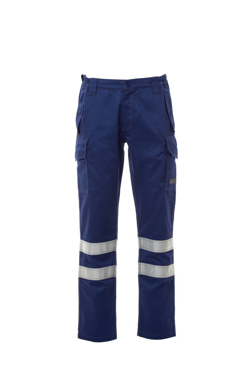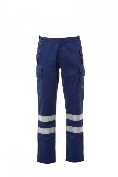Pantalón de algodón antiestático, antiácido e ignífugo, resistente al arco eléctrico y apto para soldadores; con doble banda reflectante, cinturón perfilado más alto en la parte trasera para una mejor cobertura, con elásticos laterales y trabillas en la cintura, delantero con cremallera y botón a presión. Costuras dobles en contraste y reforzadas en el interior, exterior y parte trasera de la pernera. Bolsillos delanteros de corte clásico, dos bolsillos multifunción más un bolsillo con cremallera y dos bolsillos traseros, todos ellos cubiertos con tapeta con cierre velcro. Bandas 3M retrorreflectantes aplicadas en el bolsillo trasero.