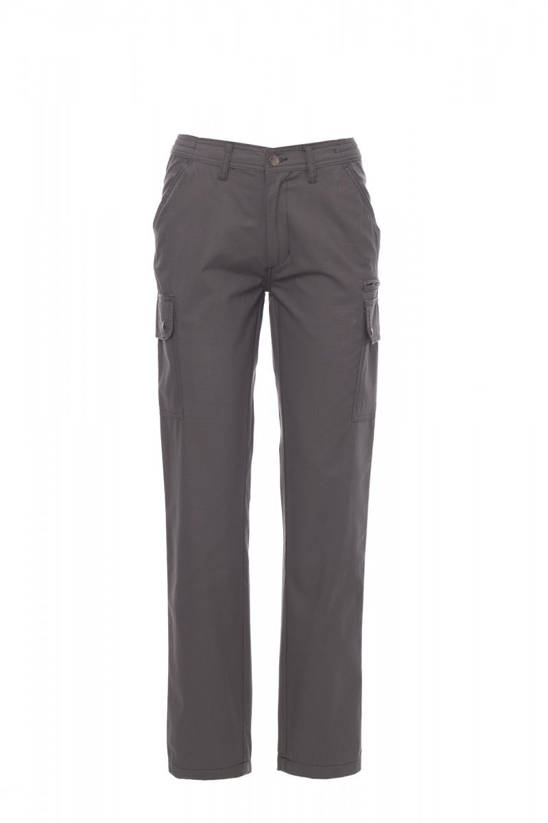 Pantalón para mujer para verano con lateral elástico y trabillas en la cintura. Cierre con cremallera y botón metálico, dos bolsillos delanteros, dos bolsillos laterales con solapa y cierres a presión, un bolsillo con cremallera en la izquierda, un bolsillo plegable para la cinta métrica en la derecha, dos bolsillos traseros con botón y ojal.
