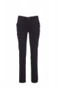 Pantalón para mujer, de corte clásico, confeccionado en tejido ripstop elástico ligero, con elásticos laterales y trabillas en la cintura, cierre con cremallera y botón de metal, dos bolsillos delanteros de corte clásico, dos bolsillos laterales con tapeta y botones a presión, un bolsillo con cremallera en la parte izquierda, un soporte para metro retráctil a la derecha, dos bolsillos traseros de ribete con ojal y botón.