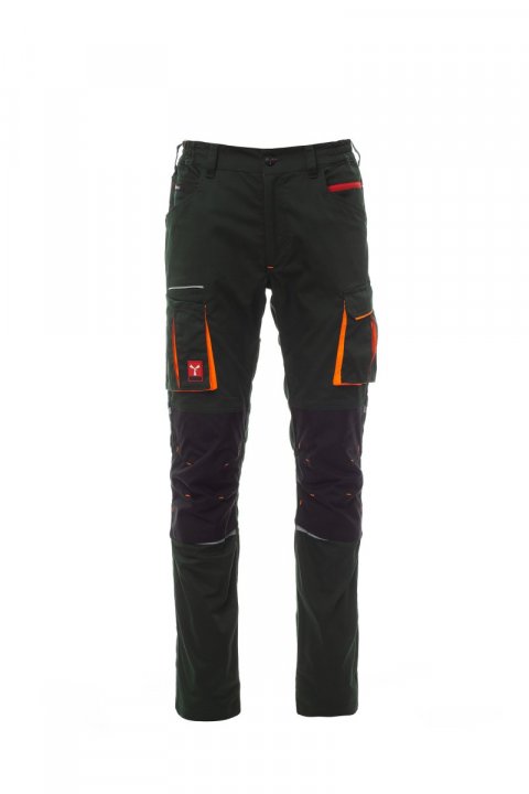 Pantalón unisex de tejido elástico, para todo el año, con elásticos laterales y trabillas en la cintura, cierre con cremallera y botón personalizado. En el delantero tiene dos bolsillos contorneados, un bolsillo pequeño para monedas a la derecha y un bolsillo pequeño de seguridad cerrado con cremallera a la izquierda. En la parte delantera de la pernera izquierda presenta un bolsillo con fuelle, tapeta con cierre de gancho y bucle y soporte para tarjeta de identificación. En la parte delantera de la pernera derecha presenta un bolsillo para el teléfono móvil con borde retrorreflectante y un bolsillo con fuelle. Ambas perneras disponen de bolsillos para rodilleras en Nylon Oxford 500D de tejido en contraste con apertura por la parte inferior y de inserciones retrorreflectantes que indican la apertura. En la parte trasera presenta un bolsillo con tapeta y cierre de gancho y bucle, un bolsillo para el metro (pernera derecha); un bolsillo abierto con dos bandas retrorreflectantes (pernera izquierda); inserciones retrorreflectantes a la altura de la rodilla y cinta talonera de tejido en contraste (ambas perneras). También presenta costuras de triple aguja en la entrepierna y en el interior y exterior de la pernera, y costuras de refuerzo en contraste en distintos puntos. En las tallas (italianas) centrales 48-50-52, el interior de la pernera tiene una longitud normal de 82 cm.