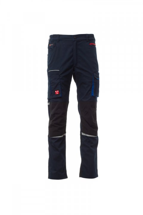 Pantalón unisex de tejido elástico, de verano, con elásticos laterales y trabillas en la cintura, cierre con cremallera y botón personalizado. En el delantero tiene dos bolsillos contorneados, un bolsillo pequeño para monedas a la derecha y un bolsillo pequeño de seguridad cerrado con cremallera a la izquierda. En la parte delantera de la pernera izquierda presenta un bolsillo con fuelle, tapeta con cierre de gancho y bucle y soporte para tarjeta de identificación. En la parte delantera de la pernera derecha presenta un bolsillo para el teléfono móvil con borde retrorreflectante y un bolsillo con fuelle. Ambas perneras disponen de bolsillos para rodilleras en Nylon Oxford 500D de tejido en contraste con apertura por la parte inferior y de inserciones retrorreflectantes que indican la apertura. En la parte trasera presenta un bolsillo con tapeta y cierre de gancho y bucle, un bolsillo para el metro (pernera derecha); un bolsillo abierto con dos bandas retrorreflectantes (pernera izquierda); inserciones retrorreflectantes a la altura de la rodilla y cinta talonera de tejido en contraste (ambas perneras). También presenta costuras de triple aguja en la entrepierna y en el interior y exterior de la pernera, y costuras de refuerzo en contraste en distintos puntos. En las tallas (italianas) centrales 48-50-52, el interior de la pernera tiene una longitud normal de 82 cm.