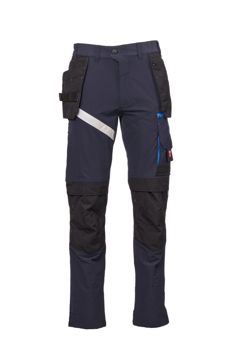 Pantalón unisex «4 way stretch», de verano, con elásticos laterales y trabillas en la cintura, cierre con cremallera y botón personalizado. Dos bolsillos flotantes en Nylon Oxford 500D, insertados en la cintura: uno con compartimento para bolígrafos y cinta para herramientas, otro con cremallera y compartimentos para guardar herramientas. En la parte delantera cuenta con dos bolsillos redondeados, un pequeño bolsillo para monedas a la derecha y un pequeño bolsillo de seguridad cerrado con cremallera a la izquierda. En la parte delantera de la pernera izquierda presenta 3 bolsillos: un bolsillo horizontal cerrado con cremallera, un bolsillo con tapeta contorneada con cierre de gancho y bucle y con soporte para tarjeta de identificación, y un pequeño bolsillo vertical cerrado con cremallera. Banda retrorreflectante en la pernera derecha. Ambas perneras disponen de bolsillos para rodilleras en Nylon Oxford 500D con apertura por la parte superior. En la parte trasera presenta un bolsillo con tapeta y cierre de gancho y bucle, una anilla para el martillo, un bolsillo abierto para el metro y un bolsillo para el teléfono móvil con tapeta y cierre de gancho y bucle (pernera derecha); un bolsillo abierto con dos bandas retrorreflectantes (pernera izquierda); inserciones retrorreflectantes a la altura de la rodilla y cinta talonera de tejido en contraste (ambas perneras). También presenta pespuntes laterales y costuras de refuerzo en contraste en distintos puntos. En las tallas (italianas) centrales 48-50-52, el interior de la pernera tiene una longitud normal de 82 cm.