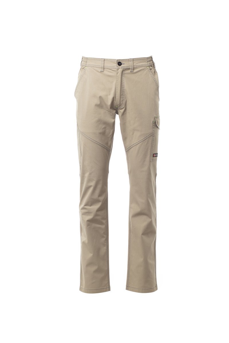 Pantalón unisex, confeccionado en tejido ripstop elástico, ligero, con bandas reflectantes, elásticos laterales y trabillas en la cintura. Cierre con cremallera y botón de plástico, dos bolsillos delanteros de corte clásico, un bolsillo lateral con LOCK SYSTEM, un soporte para metro; dos bolsillos traseros, uno con tapeta y velcro y otro abierto, aplicaciones y pespuntes de contraste, bandas reflectantes en el bolsillo trasero, costura de triple aguja.