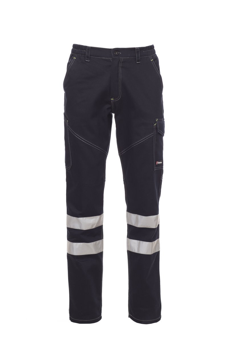Pantalón unisex, de invierno, con bandas reflectantes en cat. 1, elásticos laterales y trabillas en la cintura, cierre con cremallera y botón de plástico. Dos bolsillos delanteros de corte clásico, bolsillo lateral con LOCK SYSTEM, soporte para metro. Dos bolsillos traseros, uno con tapeta y velcro y otro abierto, aplicaciones y pespuntes de contraste, bandas reflectantes en el bolsillo trasero. Costuras de triple aguja. Pespuntes y costuras a juego, con presillas en contraste de color amarillo fluorescente para el color Negro Total.