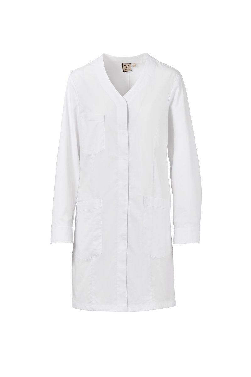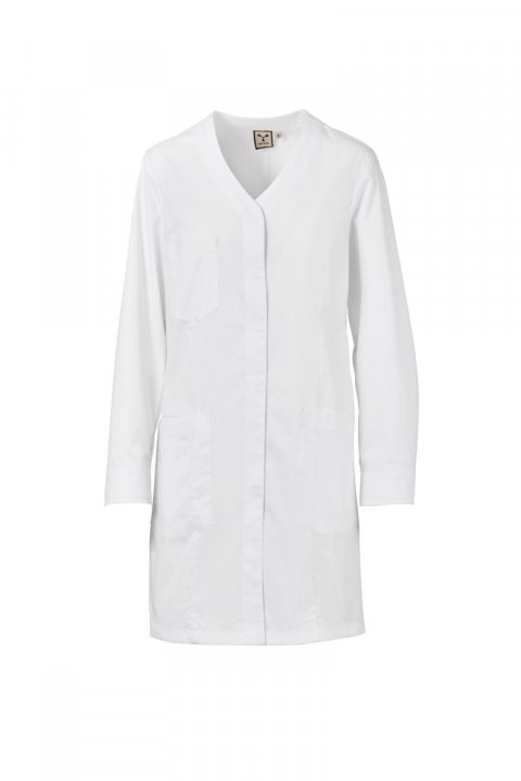 Bata larga para mujer, con cuello en pico, confeccionada en popelina de algodón, poliéster y Lycra® T400®, con excelentes propiedades elásticas y transpirables. Botonadura central cubierta, mangas largas y puños cerrados con botones automáticos.  Tres bolsillos de parche: uno en el pecho; dos inferiores, uno de los cuales con la icónica hélice Payper bordada tono sobre tono y un bolsillo interior para teléfono móvil. Espalda con corte central y en los laterales. Abertura en el bajo para facilitar el movimiento.