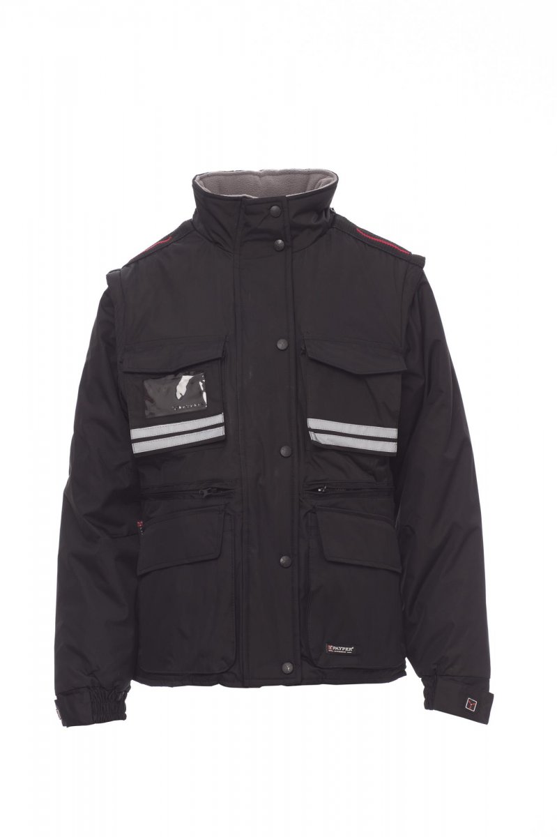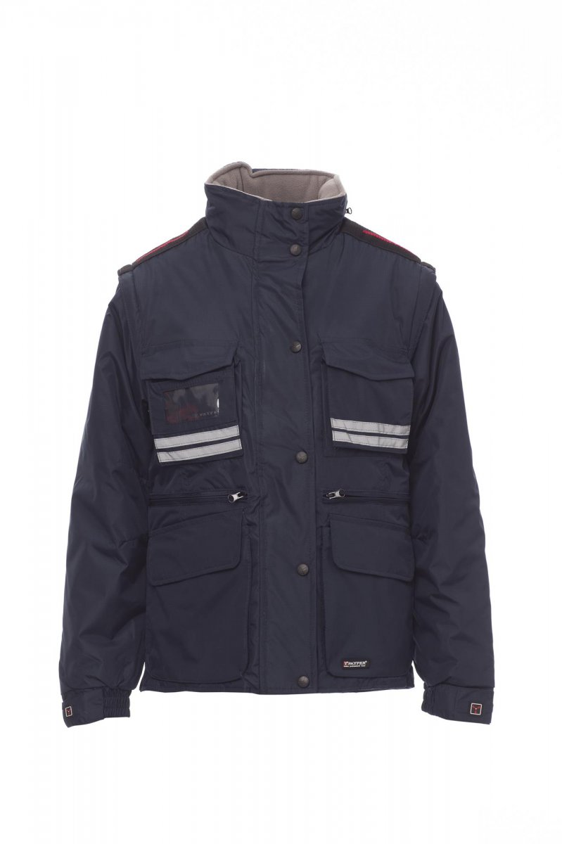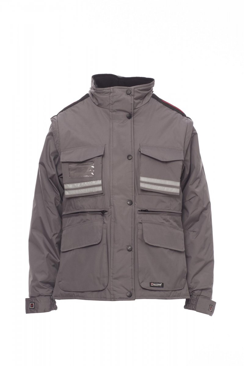 Naisten mukavasti istuva takki irrotettavilla hihoilla, 8 mm:n muovivetoketju ja metallivedin, vetoketjun peittävä nappilista ja muovinapit, irrotettava ja/tai kokoon taitettava muotoon leikattu huppu, säädettävät hihansuut, harmaat heijastavat raidat edessä ja takana, muotoillut kyynärpäät ja sivuhalkio kiilalla sekä vetoketju, yhdeksän ulkotaskua, kahdessa on LOCK SYSTEM, kahdessa on vetoketju ja vahvistettu sisusta, yhdessä käännettävä korttipidike. Topatun kauluksen sisäpuoli mikrofleeceä, selkää ja alaselkää lämmittävä kappale, hengittävät yksityiskohdat kainalossa, sisäpuolella kiristysnauha ja vetoketju helppoa painatusta ja kirjontaa varten.